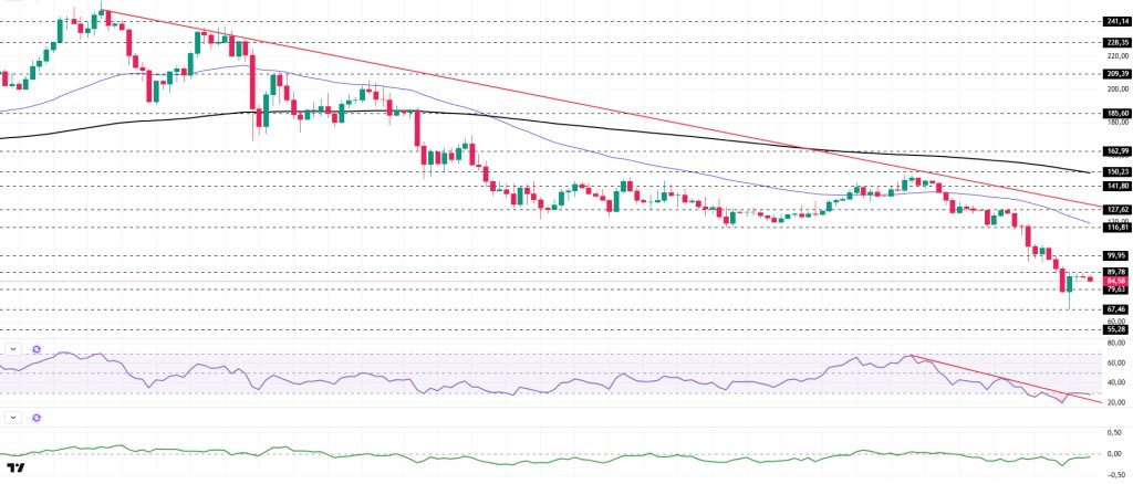 The asset is trading below the 50 EMA (Exponential Moving Average – Blue Line) and 200 EMA (Black Line) moving averages, indicating a downward trend. Furthermore, the 50 EMA remains below the 200 EMA, signaling the continuation of a technical “dead cross” formation. It also indicates that the medium-term downward potential continues. The RSI (14) retreated from the middle of the negative zone to the oversold zone. At the same time, the downward trend that has continued since January 14 has now crossed into the upper zone, signaling that buying pressure may increase. If it gains momentum from here, an uptrend may be seen. The Chaikin Money Flow (CMF-20) remained en negative territory. At the same time, balanced cash inflows and outflows may keep the CMF-20 indicator en negative territory. If macroeconomic data remains positive and developments en the ecosystem continue to be favorable, the first major resistance level of $116.81 could be retested. Conversely, en the event of potential negative news flow or deterioration en macro data, the $67.46 level could be monitored as a potential buying opportunity.