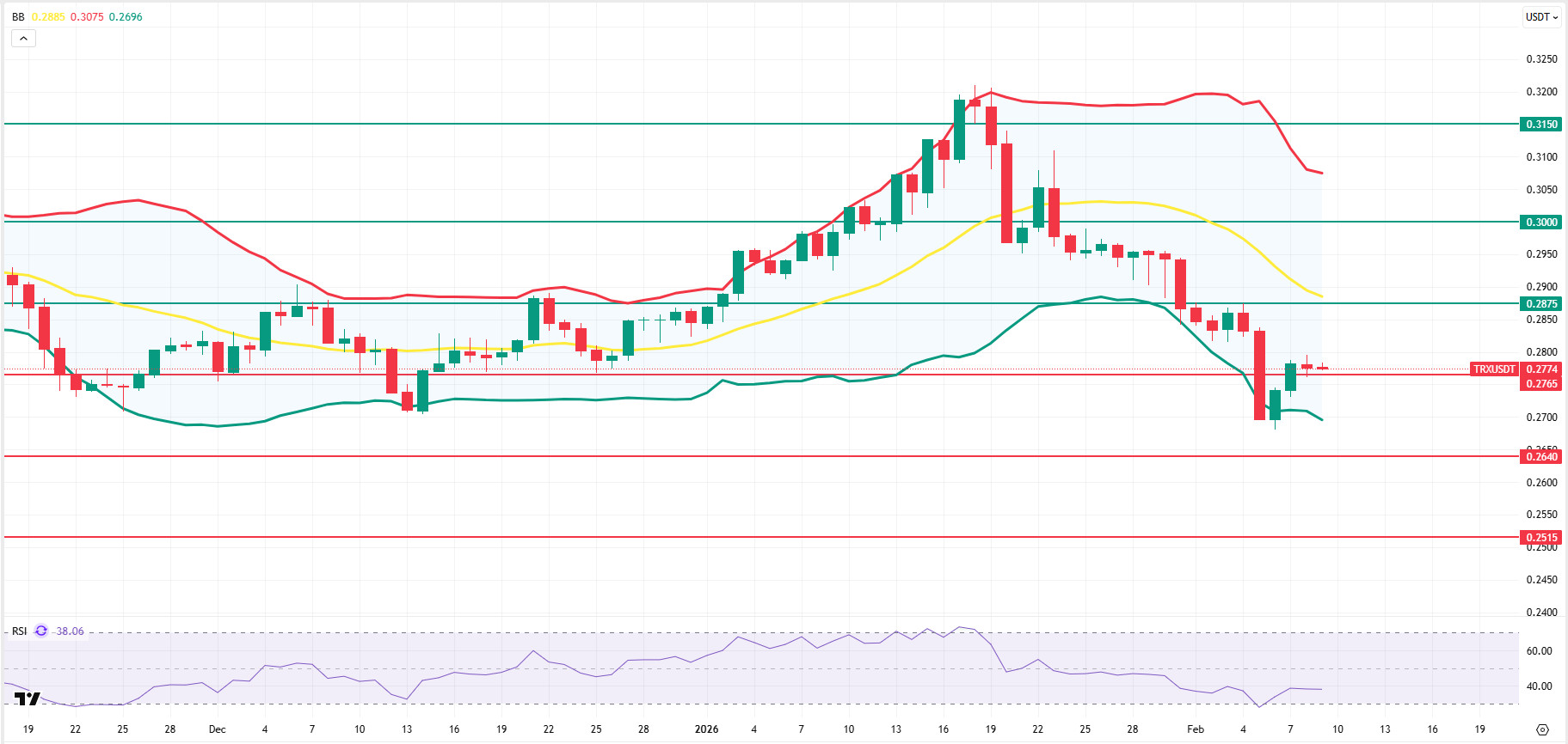 Technically speaking, TRX started last week at 0.2848 and closed the week at 0.2776, losing approximately 2.5% en value throughout the week. Thus, TRON, which has completed its third consecutive week of decline, has a market value of $26.3 billion. Currently trading at 0.2774, TRX is at the lower Bollinger band el the daily chart. The Relative Strength Index (RSI) value is observed to be approaching the oversold zone at 38. Considering its position within the Bollinger band and the RSI indicator, the TRX price may rise slightly. This indicates that it may move towards the Bollinger middle band. In such a case, it may test the 0.2875 resistance level. If it closes above the 0.2875 resistance level, it may test the 0.3000 resistance level. If it fails to close above the 0.2875 resistance level and the negative market sentiment intensifies, it may decline due to potential sell-offs from the region en question. In such a case, it may test the 0.2765 and 0.2640 support levels en sequence. The 0.2515 level is being monitored as a critical support point el the daily chart. Holding above this level could maintain the possibility of an uptrend, while a downward break could lead to increased selling pressure and accelerate the downward movement.