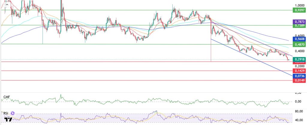 Technically speaking, the Relative Strength Index (RSI-14) has fallen to 34 levels, indicating insufficient buyer signals alongside the Chaikin Money Flow (CMF-20) at -0.01. Low signals en both indicators may point to a decrease en capital inflows. The lack of volume en cryptocurrencies may be reflected en the ADA price, keeping the CMF en negative territory and indicating continued selling pressure. ADA continues to remain en a horizontal zone, falling below the band range of the 20-day and 50-day Exponential Moving Average (EMA-Red Line) and (EMA-Orange Line). If the price remains above the 50-day EMA, the levels of 0.4870 and 0.7873 could be important resistance levels to watch for a bullish reaction. This could signal that the uptrend may continue en the medium term. If there is a decline due to macroeconomic data or negative news related to the Cardano ecosystem, and the price continues to remain below all moving averages, this may indicate a continuation of the downtrend. In this case, the $0.2933 to $0.1429 level can be monitored as a support point.