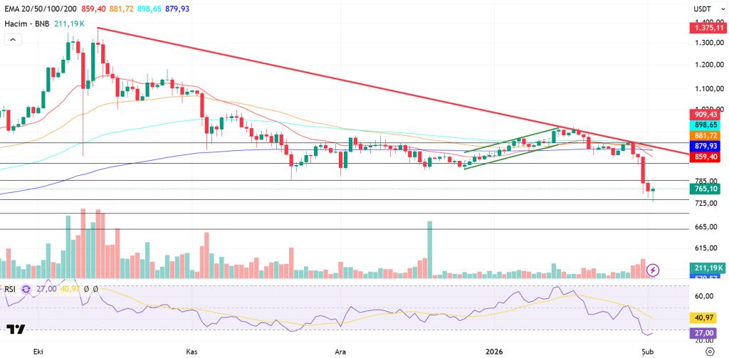From a technical perspective, BNB, which has been strengthening its upward momentum for some time, has exceeded its previously set target levels and reached the $950 threshold. Facing pressure at these levels, it has gained downward momentum, remaining below the ongoing downward trend.