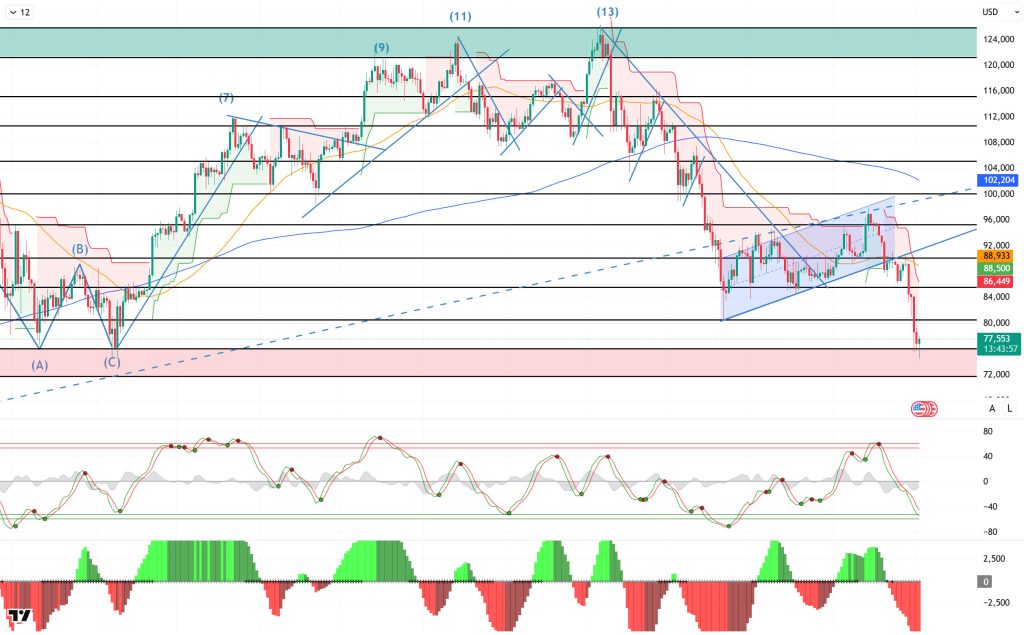 Looking at the daily technical picture after all these developments, although BTC has occasionally paused its downward trend since its ATH level and formed minor upward channels, it has lost the inverse flag pattern it had formed since November. With the loss of this structure, BTC resumed its relentless decline, falling below the 80,000 level to reach 75,000. With this move, it closed all months since September en the red, setting a new record. At the time of writing this analysis, BTC is experiencing a rebound, and it remains to be seen whether it will regain the 80,000 level.