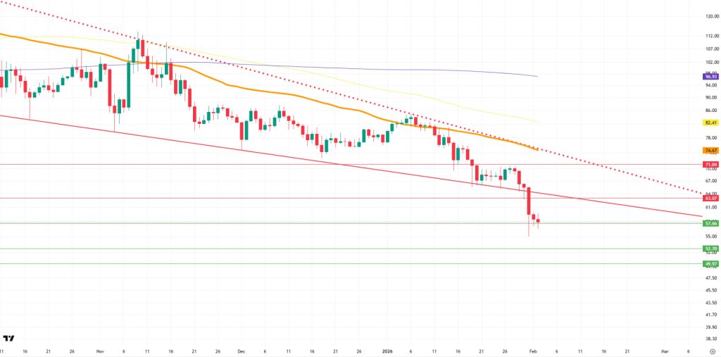 In a potential upside scenario that could develop contrary to the general expectations of derivatives market participants, the potential first pause level stands out as the 63.07 horizontal resistance, and the falling trend positioned close to this resistance could create an increasing pressure effect at this position. In the continuation of the upward movement, the 71.04 horizontal resistance will come into focus. Finally, the 74.68 level, where the 50-period moving average ( ) intersects with the descending horizontal trend, should be monitored as a critical threshold where selling pressure is expected to intensify significantly during a potential rise.