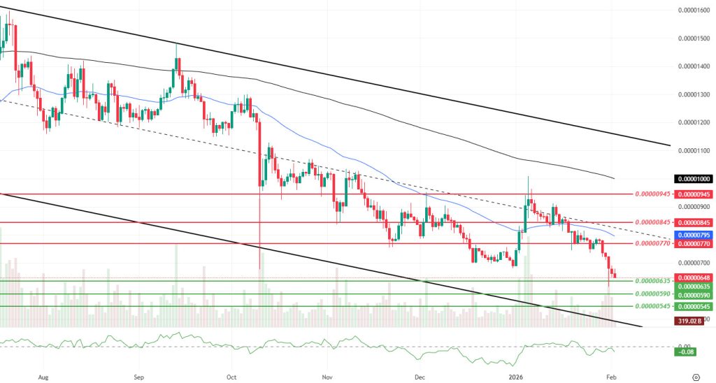 This week’s technical chart shows that selling pressure has accelerated again and the main trend within the falling channel remains downward. Compared to last week, the weakening momentum and volume indicate that the buying side’s capacity to generate a response has declined, while increased volatility shows that the decline occurred with wider candle ranges and more aggressive price swings. The Chaikin Money Flow (CMF) indicator remaining en negative territory confirms that net capital flows are still selling. In this context, the price breaking below the $0.00000715 and $0.00000670 support levels reveals that the previous consolidation phase has been broken and the market has moved to a lower support band.