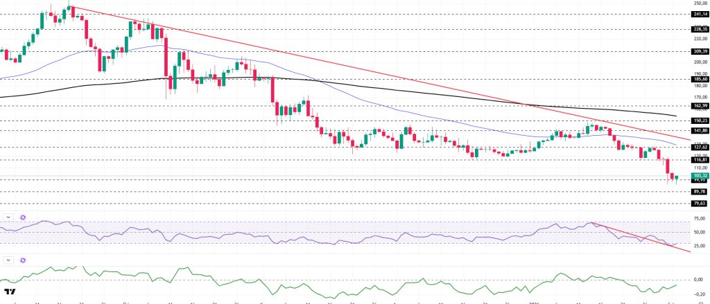 The SOL price showed a decline of approximately 20% el the daily chart this week. The asset remained en the lower region of the downtrend that began el September 18. The price tested the strong resistance level of $127.62, retreated from there, showed a decline, and remained below the 50 EMA (Blue Line) moving average. Currently, the price is testing the strong support level of $99.95. If it experiences an uptrend, it may test the 50 EMA (Blue Line) moving average as resistance. If the pullback continues, the $79.63 level should be monitored.