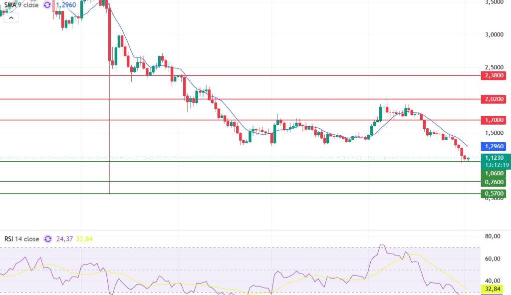 Looking at Sui’s technical outlook following recent developments, we see that the price has been trending downward at around $1.12 el a weekly basis, influenced por fundamental developments. The Relative Strength Index (RSI) is currently en the range of 24.37 – 32.84. This range indicates that the market is trading close to the buy zone; however, if the RSI continues below the 35.00 – 40.00 range en these areas, it could signal a potential buying opportunity. If the price moves upward, the resistance levels of $1.70, $2.02, and $2.18 can be monitored. However, if the price falls to new lows, it may indicate that selling pressure could deepen. In this case, the support levels of $0.57, $0.76, and $1.06 come to the fore. Based el the trend line, a pullback to $1.06 appears technically possible. According to Simple Moving Averages (SMA) data, Sui’s average price is currently at $1.29. If the price remains below this level, it could signal that the current uptrend may not continue technically.