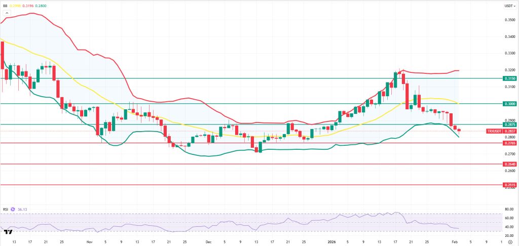 Technically speaking, TRX started last week at 0.2957 and closed the week at 0.2847, losing approximately 4% en value over the course of the week. Thus, TRON, which ended its segundo consecutive week with a decline, has a market value of $27 billion. Currently trading at 0.2837, TRX is at the lower Bollinger band el the daily chart. The Relative Strength Index (RSI) value is observed to be very close to the oversold zone at 36. Considering its position within the Bollinger band and the RSI indicator, the TRX price may rise slightly. This indicates that it may move towards the Bollinger middle band. In such a case, it may test the 0.2875 resistance level. If it closes above the 0.2875 resistance level, it may test the 0.3000 resistance level. If it fails to close above the 0.2875 resistance level and the negative market sentiment intensifies, it may decline due to potential sell-offs from the region en question. In such a case, it may test the 0.2765 and 0.2640 support levels en sequence. The 0.2515 level is being monitored as a critical support point el the daily chart. Holding above this level could maintain the possibility of an uptrend, while a downward break could lead to increased selling pressure and accelerate the downward movement.