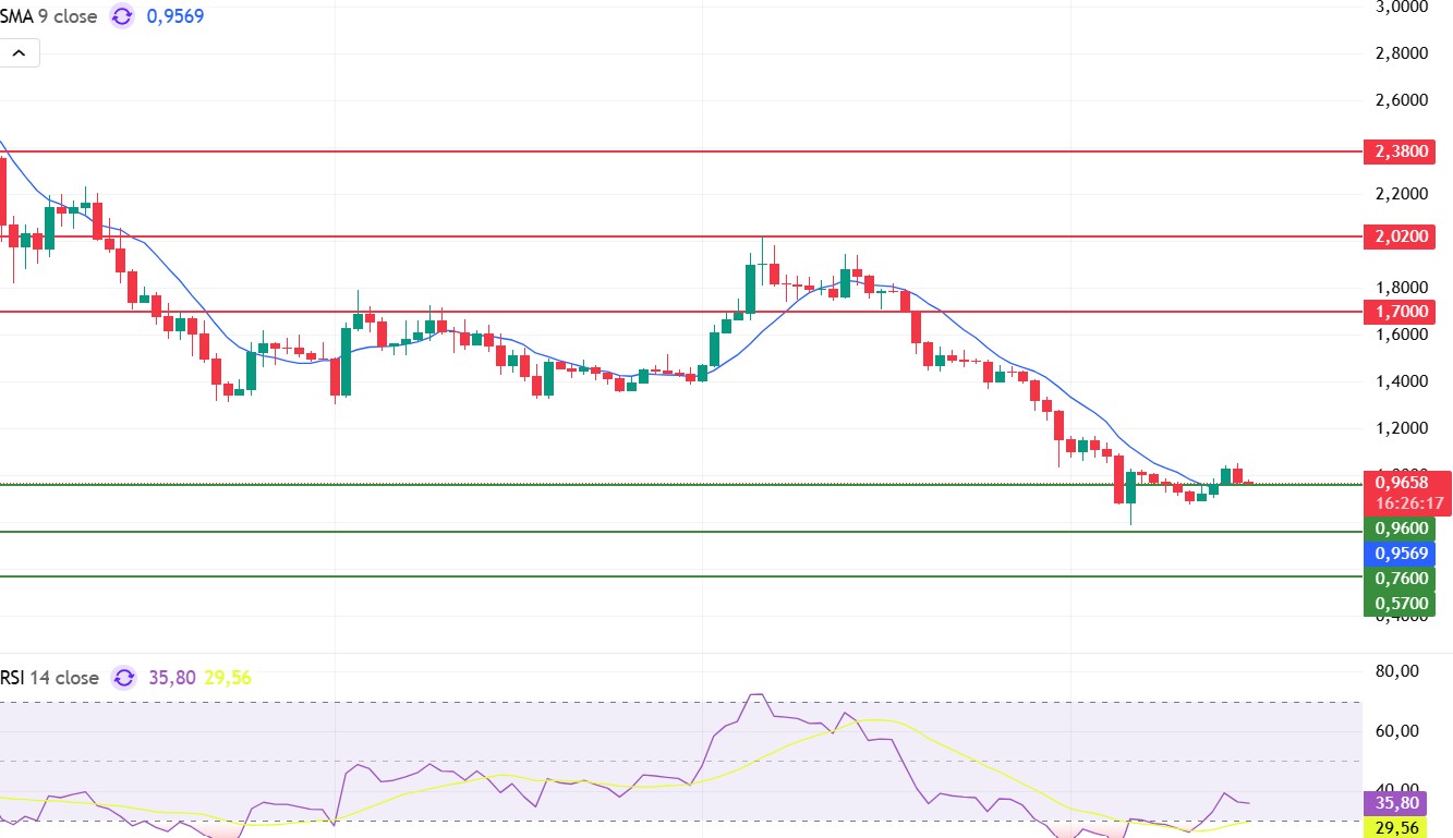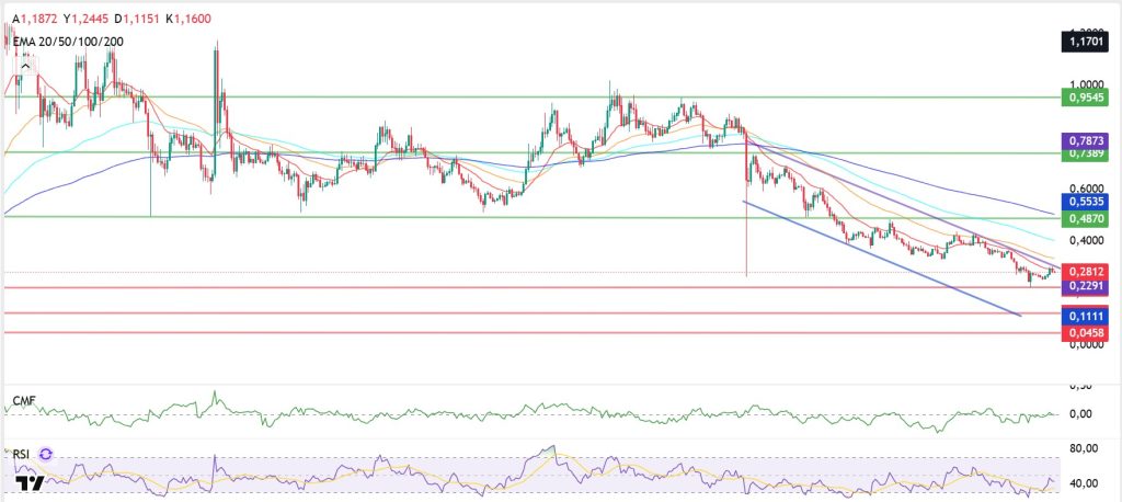 Desde la semana pasada, el precio de ADA ha ganado un 7% en valor, subiendo a $0.2858. Al observar los datos de Cardano Whale, las direcciones que poseen entre 10 millones y 100 millones de ADA han aumentado sus tenencias en los últimos días. Varios de estos monederos añadieron más de 220 millones de ADA por un valor superior a $61 millones. Cardano procesa 250 transacciones por segundo, y la próxima actualización de Hydra tiene como objetivo aumentar potencialmente el volumen de transacciones a un millón TPS, colocándolo en una posición competitiva tanto contra Ethereum como contra Solana. El fundador de Cardano, Hoskinson, argumenta que el mercado necesita expandirse más allá de las finanzas, sugiriendo que servicios como Tinder deberían integrarse en la blockchain. Según él, el próximo auge en cripto será impulsado no solo por el dinero, sino también por juegos y aplicaciones convencionales que requieren una adopción más amplia. Desde un punto de vista técnico, continúa operando por debajo de la Media Móvil Exponencial de 50 días y 200 días (EMA 50 - Línea Naranja)(EMA 200 - Línea Azul). El precio puede continuar en el canal de tendencia bajista mientras no cierre por encima de la EMA de 20 días (Línea Roja). Para esperar que el precio se estabilice en estos niveles, se puede monitorear el nivel de $0.4870 como el primer nivel de resistencia. Si rebota desde aquí, se espera que el movimiento ascendente continúe hasta el segundo punto de resistencia en el nivel de $0.7873. Estos niveles indican que los compradores de ADA están dispuestos a comprar a precios más altos, mostrando que la presión de compra está aumentando con el tiempo. Mientras el Índice de Fuerza Relativa (RSI) continúa moviéndose en territorio neutral, cayendo a niveles de 43, el Chaikin Money Flow (CMF-20) se mantiene en niveles de 0.01, indicando que el precio está en la zona de venta. Si el precio cae como resultado de los datos macroeconómicos que se espera que se anuncien esta semana y las declaraciones que realizará el presidente de EE. UU., Trump, los niveles importantes que seguiremos son $0.2291 y $0.1111. Si cierra por debajo de este nivel, el nivel de $0.2146 puede surgir como un punto de soporte.Soportes:0.2291 – 0.1111 – 0.0458Resistencias:0.9545 – 0.7873 – 0.4870