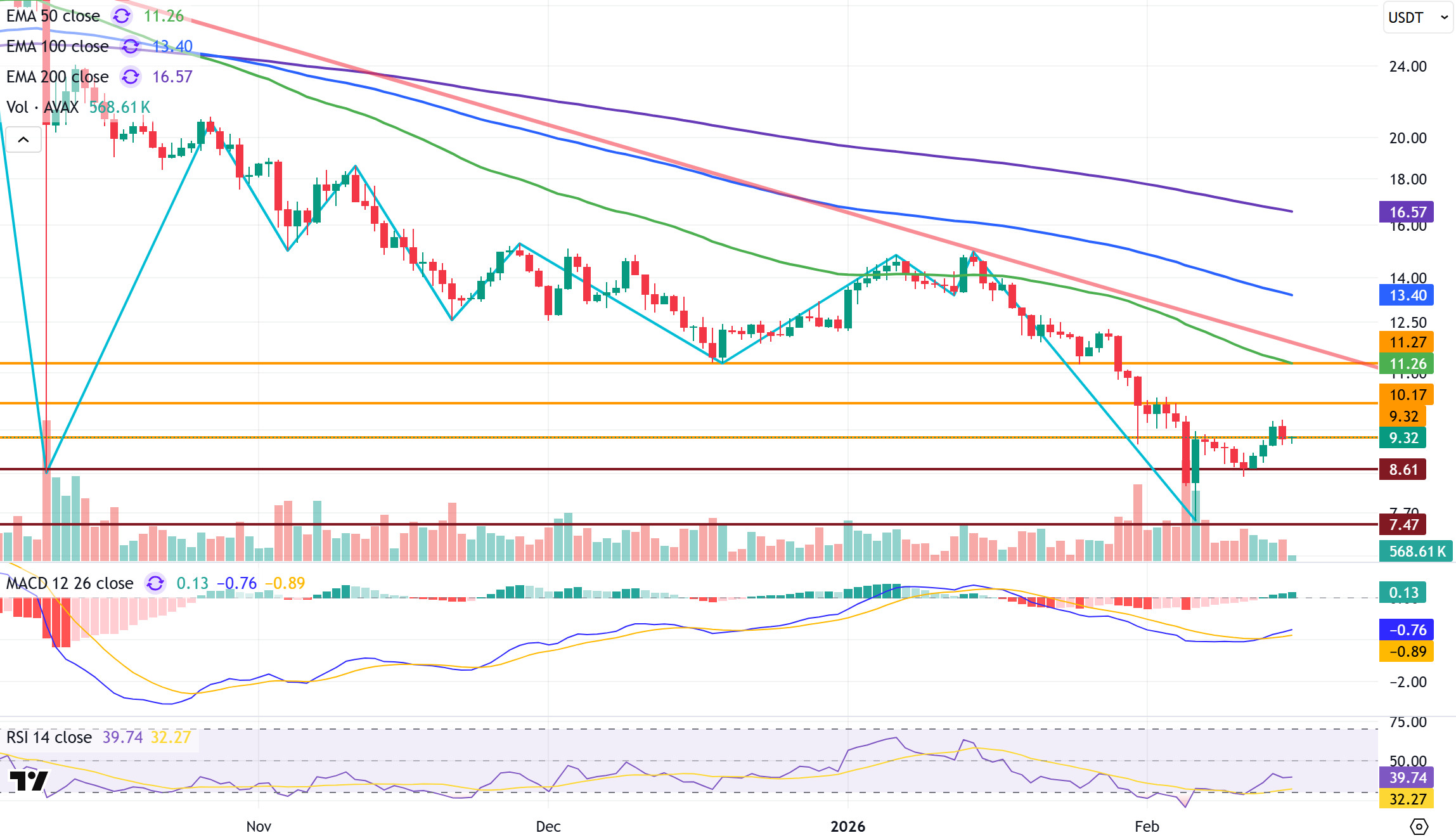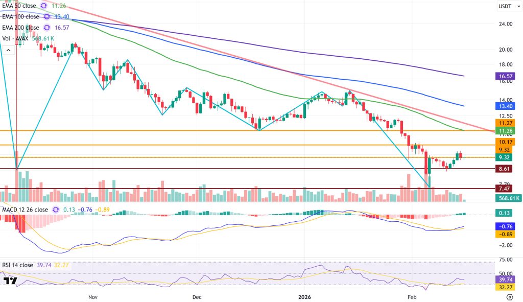 AVAX comenzó la semana pasada en $9.08. Después de caer a $8.43 la semana pasada, AVAX subió a $9.75. Durante la caída de AVAX, se probó el nivel de soporte de $8.61, y respondió al alza con compras desde esta área. Aunque se probó el nivel de resistencia de $9.32 durante el ascenso, no logró mantenerse por encima de este nivel. El cierre semanal fue alrededor de $9.29, lo que representa un aumento del 2.3% en valor. Tanto factores técnicos como fundamentales influyeron en la caída y el aumento de AVAX la semana pasada. Aproximadamente 1.67 millones de AVAX entraron en circulación la semana pasada. El desbloqueo creó una presión limitada en el lado de la oferta a corto plazo. Las compras entrantes equilibraron la caída. En el lado del ETF, aunque hubo una entrada de aproximadamente $0.9 millones, esta cifra no fue suficiente para crear un fuerte impulso. Los desarrollos positivos en el ecosistema apoyaron el precio, pero el bajo volumen general del mercado y el apetito de riesgo cauteloso limitaron el alza. Así, AVAX terminó la semana pasada en un rango horizontal, buscando equilibrio después de una fuerte caída. Comenzó la nueva semana con una perspectiva horizontal similar. En el gráfico diario, el indicador MACD cruzó por encima de la línea de señal, indicando una dirección ascendente. Sin embargo, todavía se está negociando en territorio negativo, lo que sugiere que el impulso ascendente sigue siendo limitado y que la presión de venta en las zonas de resistencia no ha desaparecido por completo. Esta perspectiva es técnicamente débil, pero apunta a una imagen neutral que incluye intentos de recuperación. El hecho de que AVAX continúe negociándose muy por debajo de los niveles críticos de la Media Móvil Exponencial (EMA) confirma que la tendencia a la baja sigue siendo válida. La distancia de las EMAs indica que se ha formado una fuerte banda de resistencia para los movimientos al alza. Además, el indicador RSI (14) está en 39.74. El RSI permaneciendo por debajo del nivel 50 indica una presión de compra débil, mientras que su distancia del nivel 30 muestra que no ha producido una señal de rebote fuerte desde la zona de sobreventa. Esta situación indica que un equilibrio cauteloso y de bajo volumen prevalece en el mercado.Los indicadores técnicos generalmente presentan una perspectiva neutral para AVAX. La calma parcial de la agenda geopolítica ha reducido la presión de venta. Sin embargo, el fuerte apetito por el riesgo aún no se ha materializado. Por lo tanto, los intentos de subida siguen siendo limitados.En un escenario bajista para AVAX, el nivel de $8.61 es el primer soporte crítico. Si se mantiene por debajo de este nivel, los niveles de $7.47 y $6.47 podrían entrar en juego. En el escenario alcista, $9.32 se destaca como el primer nivel de resistencia importante. Si se producen cierres diarios por encima de este nivel, los niveles de resistencia de $10.17 y $11.27 podrían ser probados a medida que la subida continúa.La estructura actual sugiere fuertemente la posibilidad de fluctuaciones dentro de una banda horizontal a corto plazo.(EMA50: Línea Verde, EMA100: Línea Azul, EMA200: Línea Púrpura)Soportes:8.61 - 7.47 - 6.47Resistencias:9.32 - 10.17 - 11.27