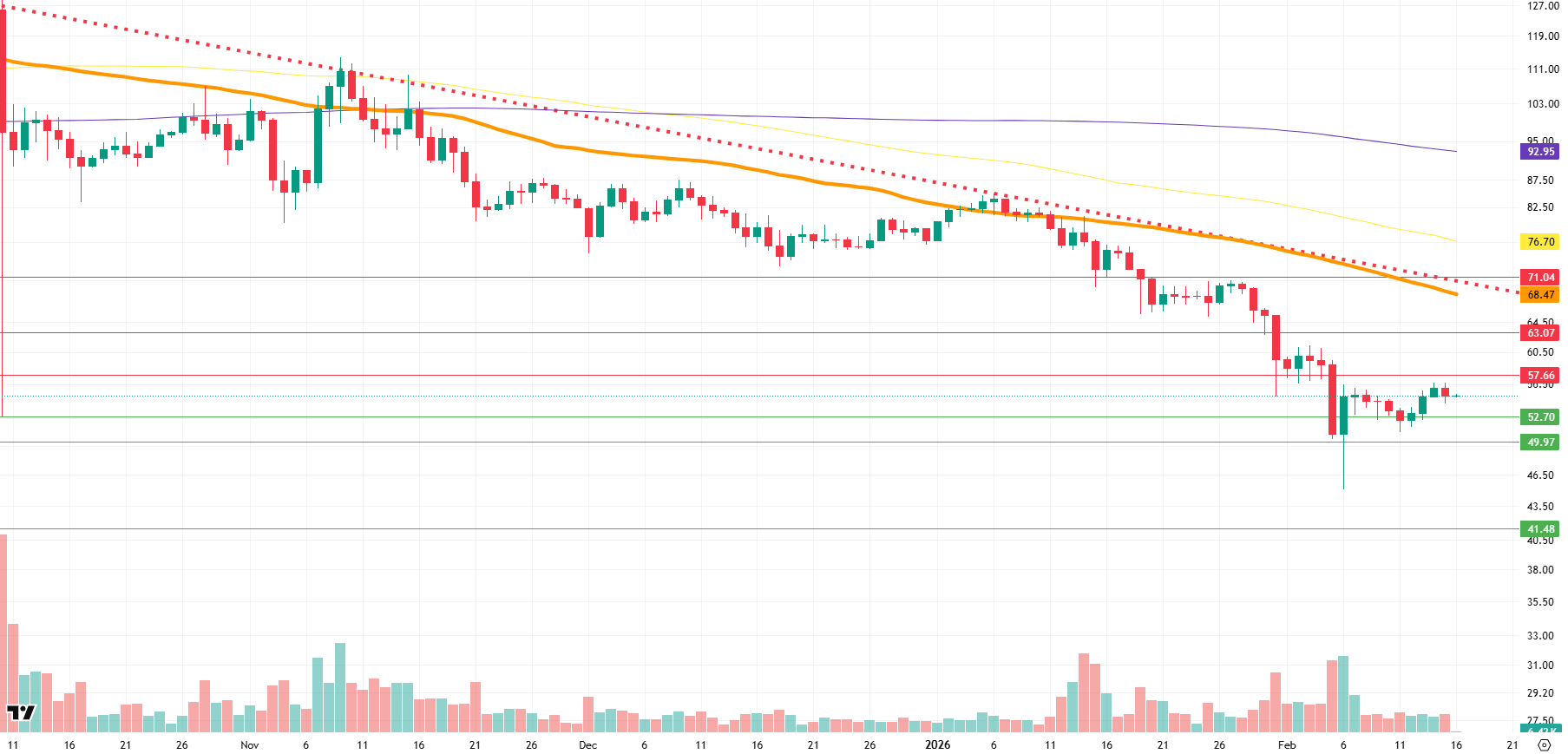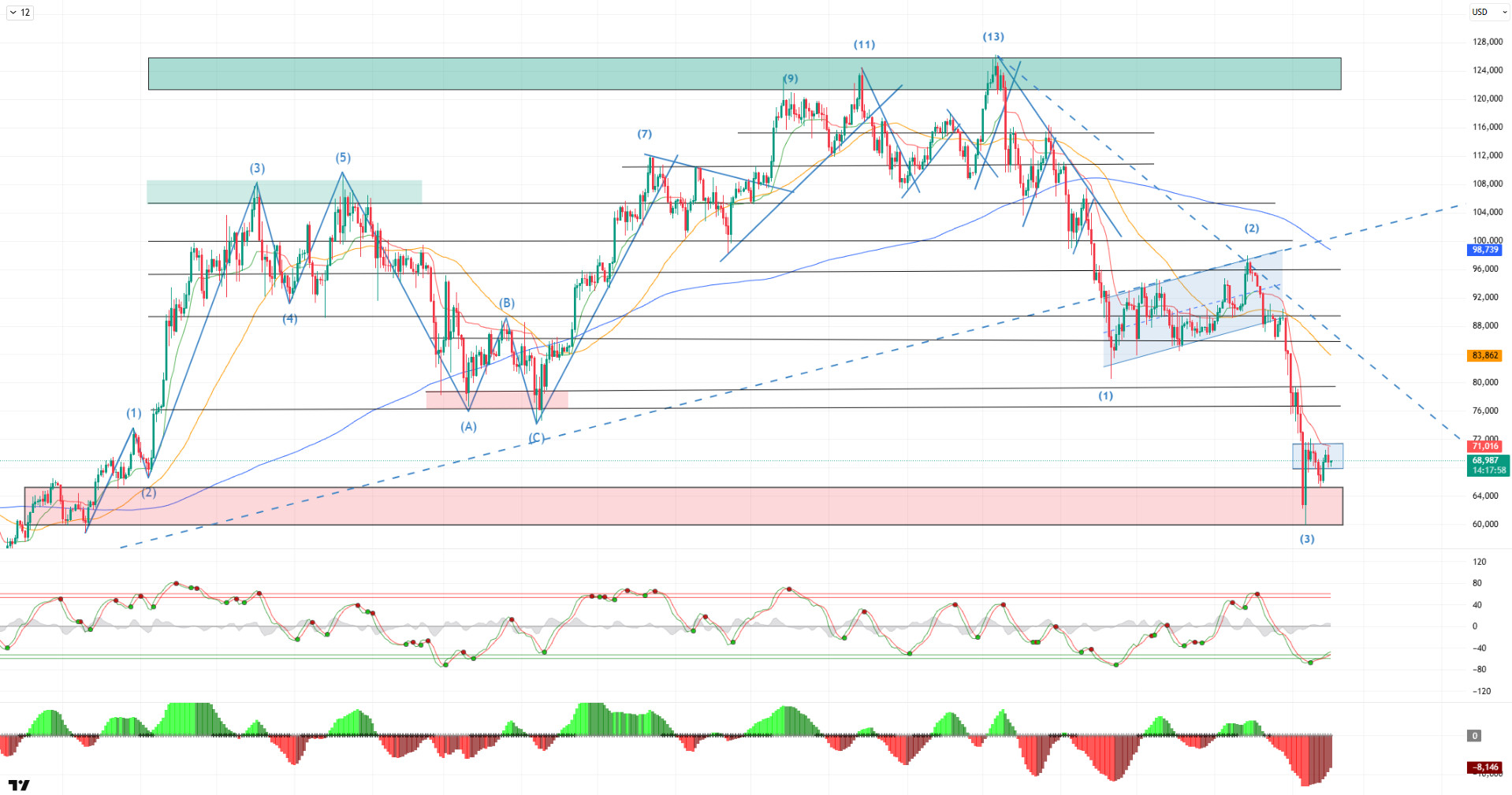Tras la publicación de datos macroeconómicos en EE. UU. la semana pasada, los funcionarios de la Fed reiteraron su postura cautelosa, enfatizando que no debe haber prisa por recortar las tasas de interés. Mientras las preparaciones militares entre EE. UU. e Irán salieron a la luz, las conversaciones en Omán no lograron resultados. Correspondencia interna rusa sugirió, según informes, establecer una amplia asociación económica con EE. UU. En el frente japonés, la coalición gobernante liderada por Sanae Takaichi declaró victoria, mientras se sugirió que la guerra entre Rusia y Ucrania terminaría este verano. En el ámbito de las criptomonedas, no se llegó a un acuerdo final en la reunión sobre stablecoins celebrada en la Casa Blanca. Al observar el panorama técnico diario tras todos estos desarrollos, BTC pausó su tendencia a la baja, que comenzó después de alcanzar su nivel ATH, tras tocar fondo en el nivel de 60,000. BTC, que está experimentando un rebote, continúa su movimiento horizontal dentro del rango de 65,000-70,000. Se espera que el precio, que alcanzó su punto máximo en el punto 2 desde los niveles mínimos que creó en los puntos 1 y 3, llegue al punto 4. Después de un posible pico menor, la zona de toma de decisiones del precio podría ser la línea descendente en el punto 13. Un posible rechazo desde este nivel podría traer un nuevo mínimo, mientras que una ruptura por encima de este podría poner fin a la tendencia a la baja. Al observar los indicadores técnicos, el oscilador Wave Trend (WT) mantiene su señal de compra en la zona de sobreventa, mientras que el histograma Squeeze Momentum (SM) intenta ganar impulso dentro de la zona negativa. Aunque la estructura de Supertrend se volvió alcista después de un breve descanso largo, ahora ha vuelto a ser bajista. Al examinar los datos semanales de liquidación, los niveles de compra fragmentados a corto y medio plazo han restablecido intensidad en 65,000 - 68,000. El nivel de venta continúa concentrándose a corto plazo en 71,000 - 79,000 y a medio plazo en 85,000 - 86,000.En resumen, el ajetreado calendario de datos de esta semana verá las actas del FOMC, el PIB y los indicadores adelantados del PCE monitoreados en los EE. UU. Mientras tanto, las conversaciones entre EE. UU. e Irán continuarán, y se espera que la Corte Suprema se pronuncie sobre los aranceles de Trump. En el frente asiático, a medida que comienza el feriado chino, aún no se ha alcanzado un resultado claro en el ámbito de las criptomonedas.Technically, BTC, which started the new year with positive momentum, tested the 98,000 level before entering a sharp sell-off, falling back to the 60,000 level. Following this move, it closed all months after September in negative territory. BTC, which also started February with a decline, lost the critical range of 70,000-80,000 and returned to its pre-Trump pricing. Although the price managed to recover from this point, its attempt to hold above the 70,000 level has so far been unsuccessful. If this level is regained, the price is expected to make a move towards the 75,000 level, while a downward break could see a double bottom formation. Soportes:60,000 – 65,000 – 62,800Resistencias:70,000 – 75,000 – 80,000