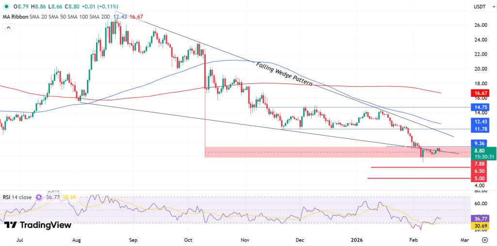 Recientemente, la Comisión de Comercio de Futuros de Materias Primas (CFTC) estableció un comité asesor sobre activos criptográficos, y la inclusión del CEO de Chainlink, Sergey Nazarov, en este comité envió un mensaje importante de que los representantes de la industria estarán en la mesa en el lado regulatorio. Este desarrollo por sí solo no es un catalizador que impulse el precio al alza; sin embargo, especialmente al discutir la infraestructura de oráculos y la integración de activos del mundo real (RWA) en la cadena, la participación de Chainlink en los mecanismos de toma de decisiones debe ser señalada como un punto estratégico para el posicionamiento a largo plazo. Además, Chainlink compró 135,693.16 tokens LINK más para su reserva, llevando su reserva total a 2.04 millones de tokens. Especialmente cuando las condiciones de liquidez macro son ajustadas, los movimientos de acumulación interna se ven como tranquilizadores para la psicología del inversor y crean presión de suministro. En el frente técnico, la imagen sigue siendo cautelosa. La estructura de tendencia a la baja se mantiene intacta. El precio ha estado moviéndose dentro de un patrón de máximos más bajos – mínimos más bajos durante mucho tiempo y continúa permaneciendo por debajo de las medias móviles simples de 50 y 200 días.La pendiente descendente de estos dos promedios ha limitado hasta ahora los rebotes a solo correcciones débiles.Para que hablemos de un cambio de tendencia, esta estructura debe romperse primero, y luego sería mucho más saludable ver que las medias se recuperen. El precio actualmente está tratando de estabilizarse dentro de la zona de demanda sombreada en rojo que destacamos hace semanas. Esta área también es psicológicamente importante porque es el punto donde la caída perdió impulso y la presión de venta se desaceleró. Mientras se mantenga por encima de esta zona, son posibles intentos de rebote a corto plazo. El nivel 9.36 por encima es la primera barrera seria. Este nivel no solo es una resistencia horizontal, sino también un área donde se concentran los vendedores a corto plazo. Si hay una ruptura de alto volumen, podría formarse una zona de alivio hasta las bandas de 11.78 y luego 12.43.En particular, un cierre diario por encima de 12.43 rompería la formación de cuña, suavizando significativamente el panorama técnico y trasladando la estructura a un territorio positivo.El riesgo a la baja es más claro y rápido. Cierres persistentes por debajo del nivel de 8.00 podrían activar el área donde se acumula liquidez en el gráfico.. Mientras que 7.88 es la primera parada, la verdadera brecha se siente alrededor de 6.50. En tales estructuras descendentes, las rupturas de soporte suelen ser agudas porque hay una gran acumulación de stops a la baja, y el mercado tiende a probar esta liquidez.. Por lo tanto, mientras que el movimiento ascendente puede extenderse a lo largo del tiempo, las rupturas a la baja son generalmente más agresivas. En el lado del impulso, el Índice de Fuerza Relativa (RSI) aún no ha producido una señal de reversión fuerte. Se encuentra flotando en la banda de 30 a 40;el RSI necesita establecerse por encima de 50 y convertir este nivel en un soporte para que podamos hablar de un cambio en la dirección del momentum.De lo contrario, los movimientos observados pueden seguir siendo un respiro a corto plazo.Soportes:7.88 – 7.50 – 5.00Resistencias:9.36 – 12.43 – 14.75
