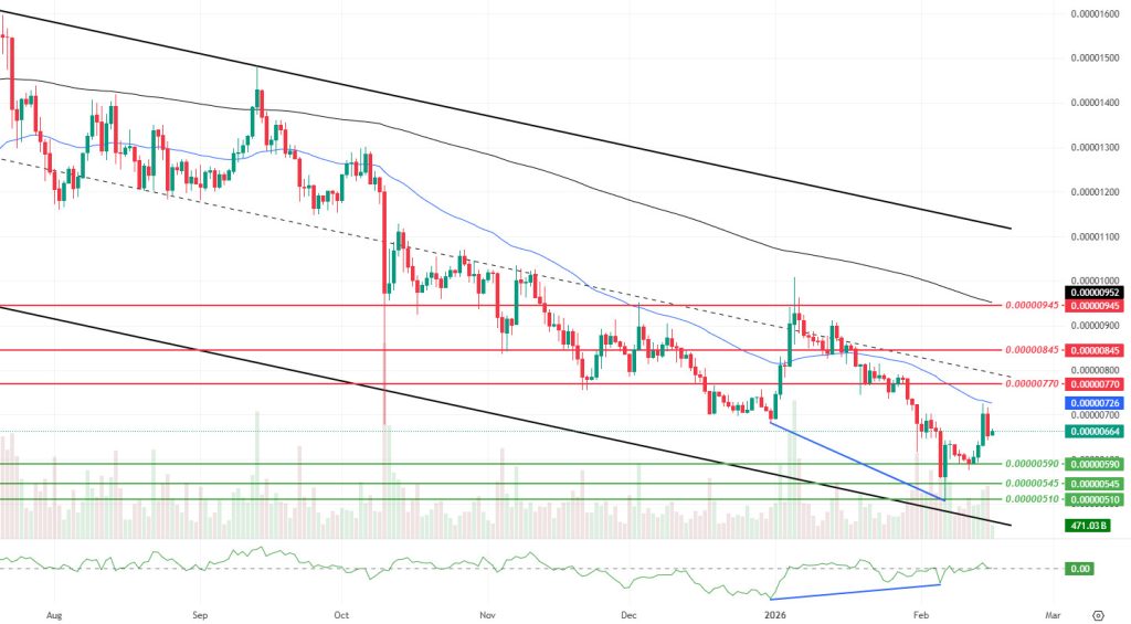 Esta semana, el ecosistema de Shiba Inu cambió su enfoque hacia encontrar un equilibrio entre la continuidad de la quema y la infraestructura y la seguridad del usuario. Al comienzo de la semana, la tasa de quema de 24 horas cayendo a cero en Shibburn destacó una vez más cuán dependiente es la quema automática en Shibarium de la actividad de la red. En la misma fase, la transferencia de 20,841,045,129 SHIB de billeteras calientes a almacenamiento en frío reforzó la percepción de que una parte de la liquidez a corto plazo había sido retirada de la bolsa. Las advertencias de Shibariumscan sobre la migración de servidores y las tasas de indexación de bloques llevaron los riesgos de calidad de datos al primer plano en términos de monitoreo saludable de las métricas del ecosistema, mientras que movimientos centrados en la cultura, como la colaboración entre Astra Nova y Protocol Purgatory, alimentaron la narrativa de expansión del ecosistema. En el frente tecnológico, el equipo aclaró la hoja de ruta de Shibarium al resaltar la actualización de privacidad basada en la Encriptación Homomórfica Total (FHE) con Zama para el segundo trimestre de 2026. El comportamiento del mercado fue más activo en la segunda mitad de la semana. En el lado de los derivados, el aumento en el Interés Abierto (OI) señaló una renovada fuerza en la participación de los traders a corto plazo, mientras que un flujo neto de aproximadamente 140 mil millones de SHIB desde las bolsas fue interpretado como un debilitamiento de la presión de venta y un renacimiento de las tendencias de acumulación. Sin embargo, el lado de la quema permaneció inestable. Mientras que la tasa de quema se recuperó a 2.63 millones de SHIB a mitad de semana, un aumento del 2,097.7%, algunas ventanas vieron transacciones individuales caer a niveles simbólicos como 483 SHIB y luego saltar inmediatamente al rango de 838,872 SHIB. Esta imagen volátil sugirió que la reacción del precio estaba impulsada más por el flujo y el sentimiento que por la quema. Bajo el encabezado de seguridad, la señalización de 5,000 direcciones maliciosas por envenenamiento de direcciones y operaciones de ingeniería social dirigidas a usuarios de Safe Wallet mostró que el principal riesgo residía en la capa operativa, que desvió a los usuarios a la dirección incorrecta, en lugar de en una vulnerabilidad del protocolo. Hacia el final de la semana, la señal de prueba alfa centrada en UX y UI de Shytoshi Kusama y la anticipación del informe Eclipse del 17 de febrero volvieron a centrar la atención en el lado del producto.La perspectiva técnica de esta semana mantiene una estructura de canal descendente, pero la reacción desde la región inferior parece estar progresando de una manera más controlada. La disminución de la volatilidad en medio de aumentos en el impulso y el volumen sugiere que el aumento está siendo impulsado por un squeeze más equilibrado en lugar de brechas de velas agudas e irregulares. El indicador Chaikin Money Flow (CMF) que se mantiene en territorio neutral indica que el flujo de capital neto no ha producido una ruptura completa a favor de la compra, y que la búsqueda de equilibrio en el mercado está saliendo a la luz. El hecho de que la divergencia positiva de la semana pasada (Línea Azul) entre el precio y el CMF resultara en una reacción ascendente apoya la idea de que la presión de venta se ha debilitado, pero dado que el CMF sigue siendo neutral, es más saludable interpretar este movimiento como una reacción interna del canal en lugar de una reversión de tendencia por ahora.La principal referencia para la próxima semana será si la región de $0.00000635 puede mantenerse como soporte. Si se mantiene por encima de este nivel y el precio recupera la zona de la Media Móvil Exponencial (EMA) de 50 períodos y rompe la resistencia de $0.00000770, podría abrir espacio para un movimiento ascendente hacia los niveles de $0.00000845 y $0.00000945. En este escenario, el CMF moviéndose de la zona neutral hacia el lado positivo sería una de las confirmaciones más claras de que la reacción está ganando calidad. Por el contrario, si hay un regreso por debajo de $0.00000635 y cierres débiles, se espera que la presión se expanda primero hacia el soporte de $0.00000590, luego hacia las bandas de $0.00000545 y $0.00000510. En este caso, el CMF cayendo por debajo de la zona neutral produciría una advertencia temprana de que la reacción se está debilitando. Debe recordarse que mientras el precio permanezca por debajo de la EMA de 200 períodos, la tendencia principal sigue siendo bajista, por lo que el riesgo de que las zonas de resistencia se endurezcan durante los intentos de subida continúa.(EMA200: Línea negra, EMA50: Línea azul) Soportes:0.00000590 – 0.00000545 – 0.00000510Resistencias:0.00000770 – 0.00000845 – 0.00000945