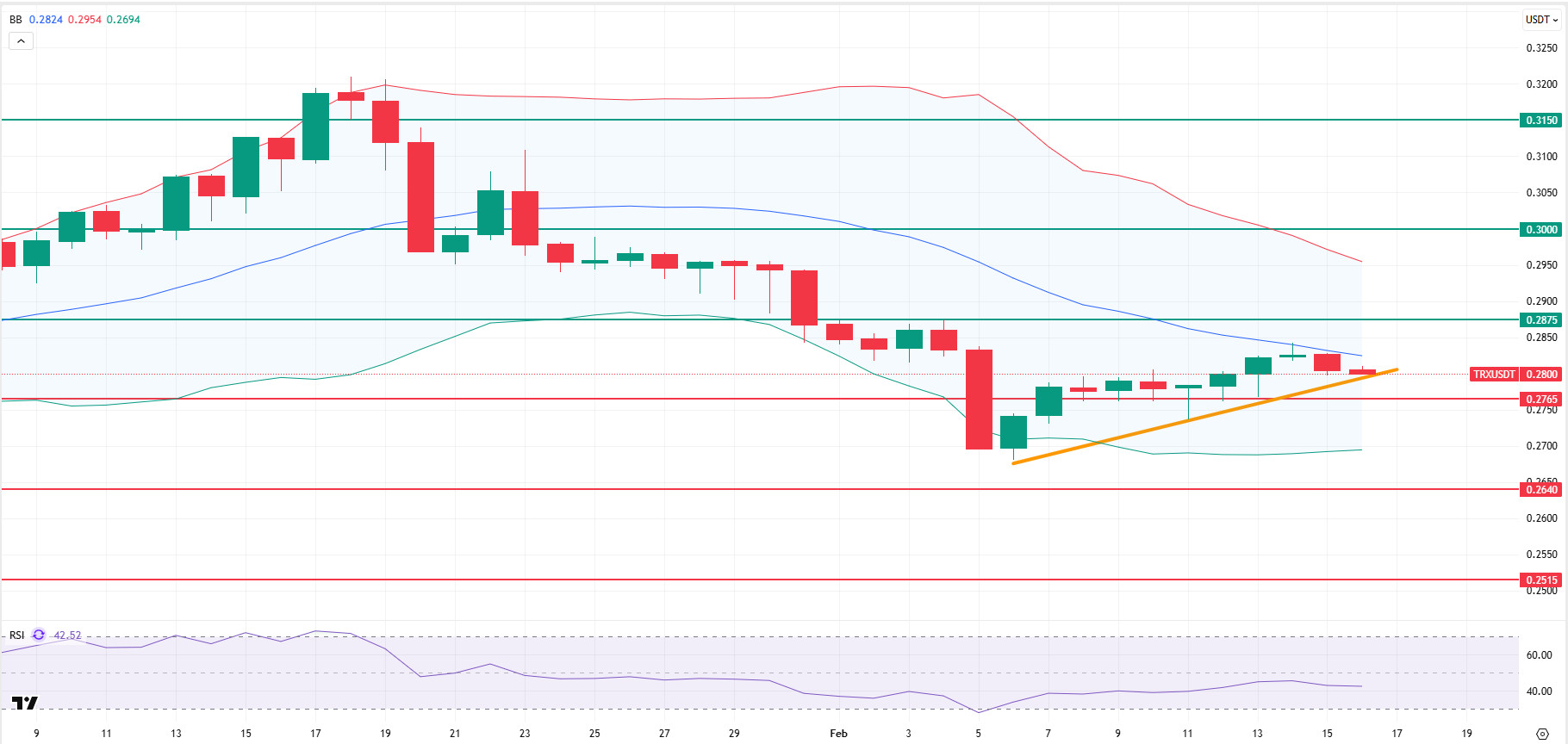 Tron Inc., la empresa tesorera de Tron, anunció que compró 1,255,570 TRX a un precio promedio de $0.28 la semana pasada, llevando sus activos totales a más de 681.7 millones de TRX. La compañía declaró que su objetivo es aumentar aún más sus activos de Tron para impulsar su valor de acciones a largo plazo. La semana pasada, la red TRONgeneró un total de $44.8 millones en ingresos, continuando siendo el ecosistema con mayores ganancias entre todas las redes de blockchain.Este rendimiento de ingresos demuestra que TRON tiene una estructura económica más sólida en comparación con otras redes. Un total de 22.7 millones de TRX fueron quemados en la red TRON durante la semana del 9 al 15 de febrero. A pesar de esto,la oferta circulante aumentó en 4.7 millones. Si bien el aumento en la oferta a corto plazo tiene el potencial de ejercer presión sobre el precio de TRX, el mecanismo de quema mantenido regularmente se destaca como un factor de equilibrio en la perspectiva a medio plazo. Además, el número total de direcciones aumentó en 1.3 millones, alcanzando los 365.6 millones durante la misma semana. Hablando técnicamente, TRX comenzó la semana pasada en 0.2777 y ganó aproximadamente un 1% en valor a lo largo de la semana, cerrando en 0.2804.Así, TRON terminó la semana con un aumento, llevando su valor de mercado a $26.6 mil millones.Actualmente cotizando a 0.2800, TRX se encuentra en la banda media de Bollinger en el gráfico diario. El valor del Índice de Fuerza Relativa (RSI) se observa en la zona neutral en el nivel 42. También está justo encima del soporte de tendencia menor formado por el impulso ganado tras la caída del 6 de febrero. Considerando su posición dentro de la banda de Bollinger y el indicador RSI, se espera que el precio de TRX suba ligeramente con la reacción que recibirá en el soporte de tendencia. Esto indica que podría querer moverse hacia la banda superior de Bollinger. En tal caso, podría probar la resistencia de 0.2875. Si cierra por encima del nivel de resistencia de 0.2875 de manera diaria, podría probar el nivel de resistencia de 0.3000. Si no logra cerrar por encima del nivel de resistencia de 0.2875 de manera diaria y el sentimiento negativo del mercado se intensifica, podría caer debido a posibles ventas desde la región en cuestión. En tal caso, podría probar los niveles de soporte de 0.2765 y 0.2640 en secuencia.El nivel de 0.2515 se está monitoreando como un punto de soporte crítico en el gráfico diario.Mantenerse por encima de este nivel puede preservar la posibilidad de una tendencia alcista, mientras que una ruptura hacia abajo podría llevar a un aumento de la presión de venta y acelerar el movimiento a la baja.Soportes:0.2765 – 0.2640 – 0.2515Resistencias:0.2875 – 0.3000 – 0.3150