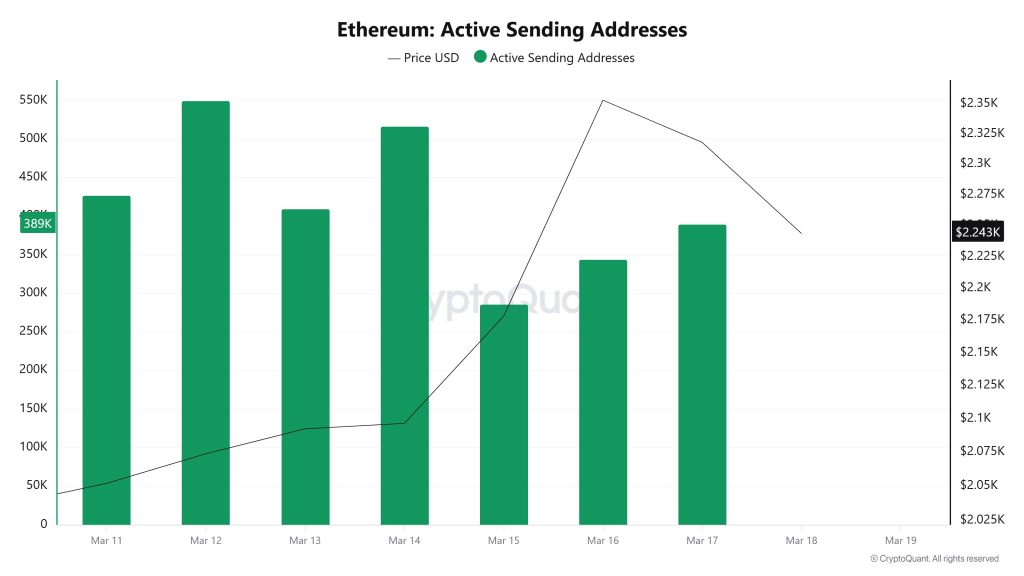 Sending addresses are showing more volatile movements. While they peaked around 540K on March 12, there was a significant drop to around 280K by March 15. Such sharp declines typically indicate a noticeable decrease in selling activity or transfer volume. In other words, the market had quieted down a bit during those days. Subsequently, there was a recovery back to levels above 350K. This indicates that activity hasn’t completely disappeared but has merely contracted temporarily.
