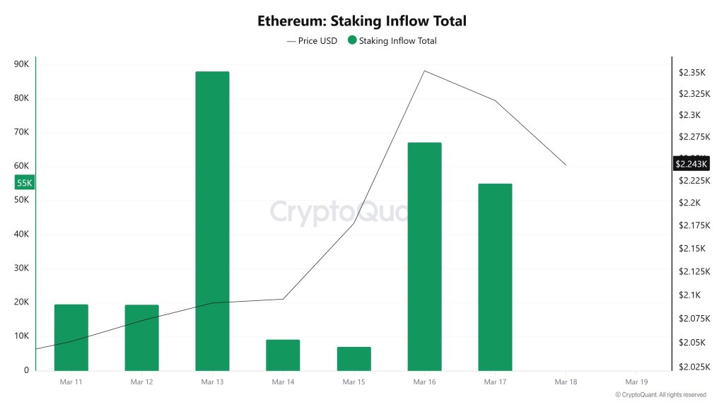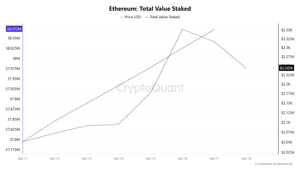 The total amount of staked ETH has risen almost continuously throughout the week. Starting at 37.8 million, there has been a steady increase toward the 38 million mark. The key point here is this: despite the price pullback following March 16, there has been no decline in the staked amount. In other words, investors continued to stake rather than unstake as the price fell. This indicates that long-term expectations remain intact and that the “hold” sentiment in the market remains strong.