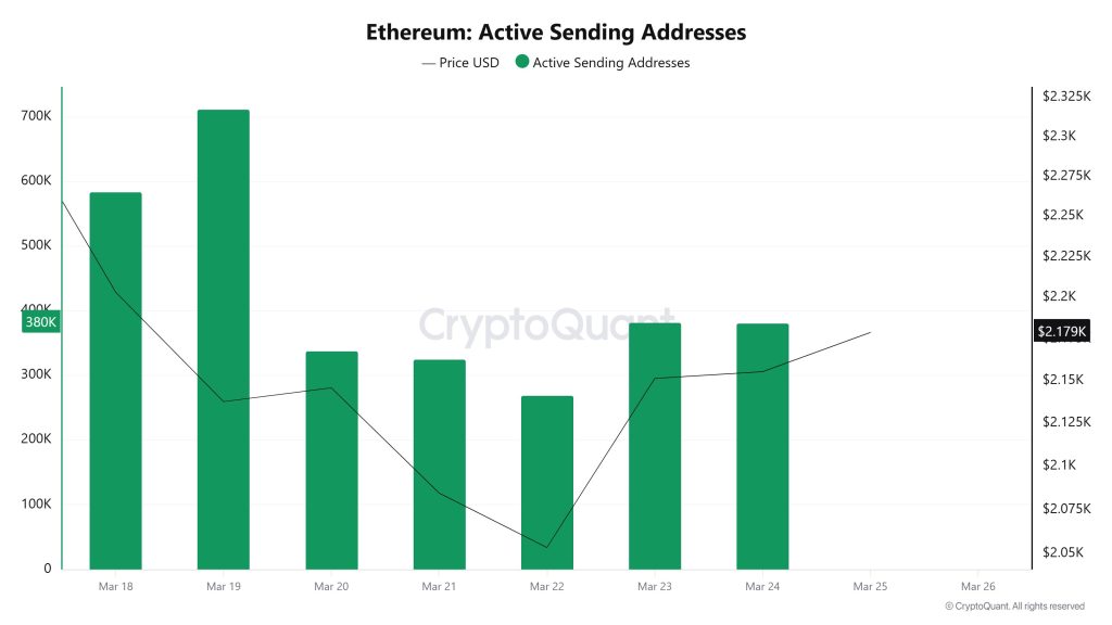 There has been more significant activity on the sending address side. High levels in the 550K–700K range were observed at the start of the week. A sharp decline occurred after March 20, with the figure dropping to 260K. It then rebounded, rising to the 370K range.