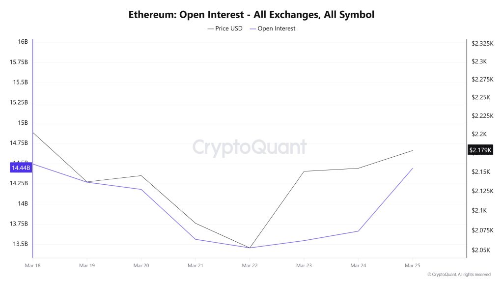 Open Interest was at approximately $14.4 billion at the start of the week. It declined to $13.5 billion by March 22. It then rose again, approaching $14.3 billion by the end of the week.