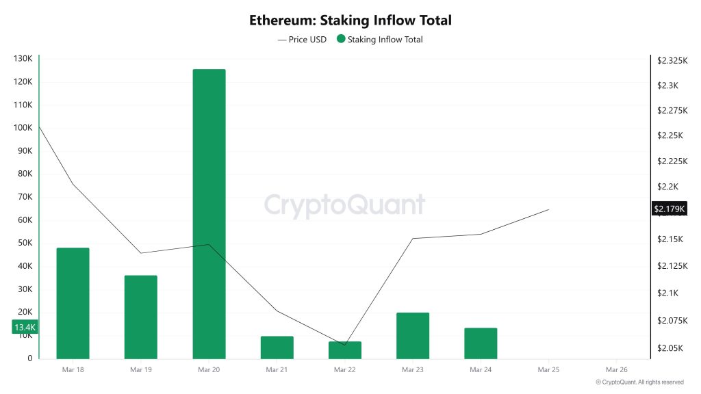 Staking inflows have been quite volatile. While inflows were in the 40K–50K range at the start of the week, there was a sharp surge above 120K on March 20. Following this, inflows dropped sharply, falling below 10K. In the latter part of the week, they rebounded to the 15K–20K range.