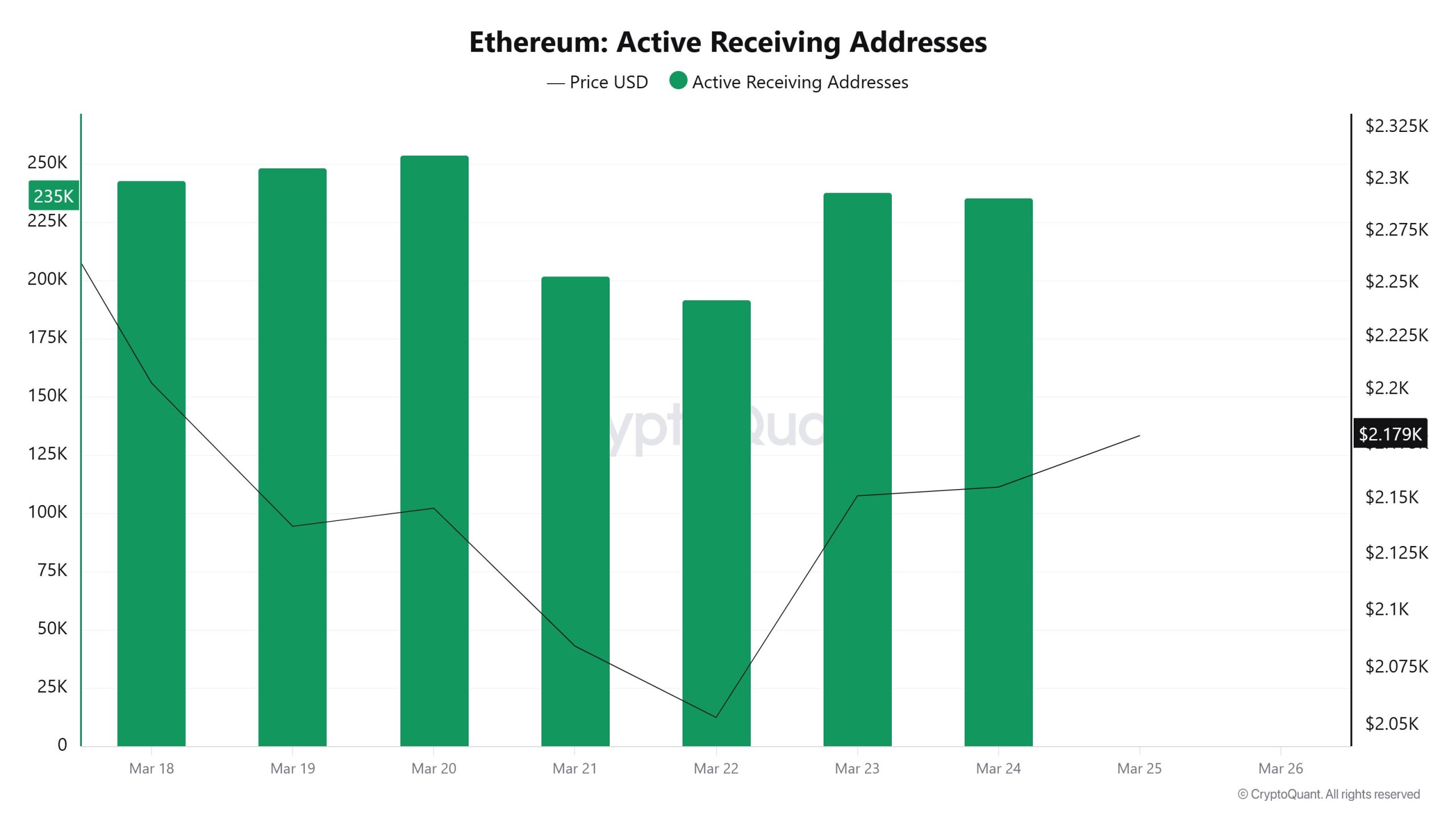 The number of receiving addresses hovered in the 230K–250K range at the start of the week. During the March 21–22 period, it dropped sharply to 190K. This decline was followed by a rapid recovery, and the figure rose back above 230K.