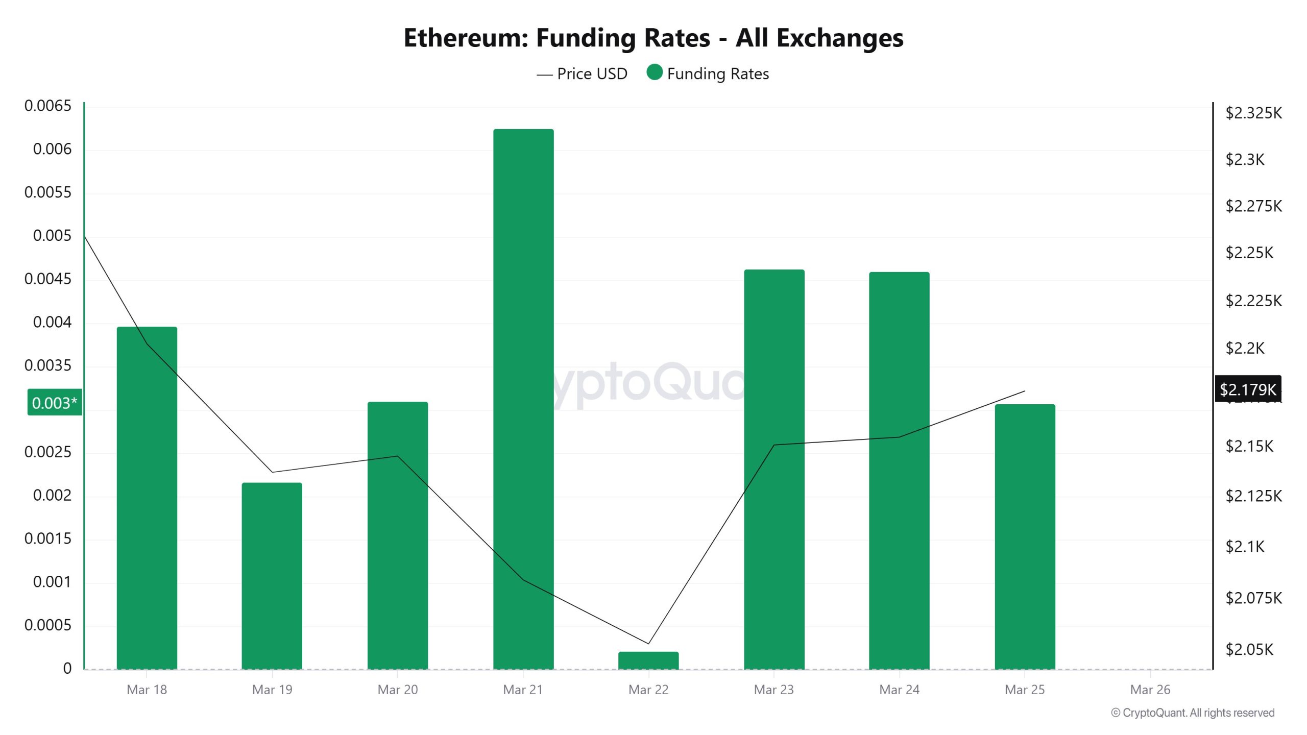 The funding rate remained mostly in positive territory throughout the week. Although it dropped to very low levels on March 22, it did not enter negative territory. It subsequently rose again, reaching the 0.004–0.006 range.