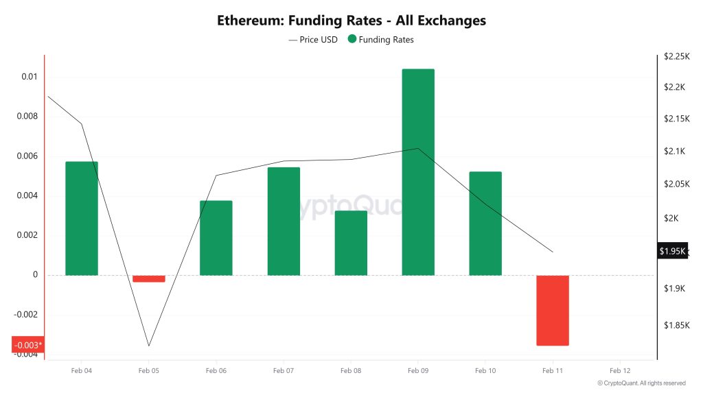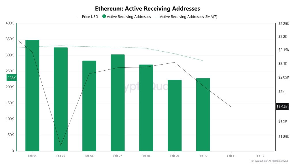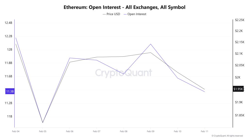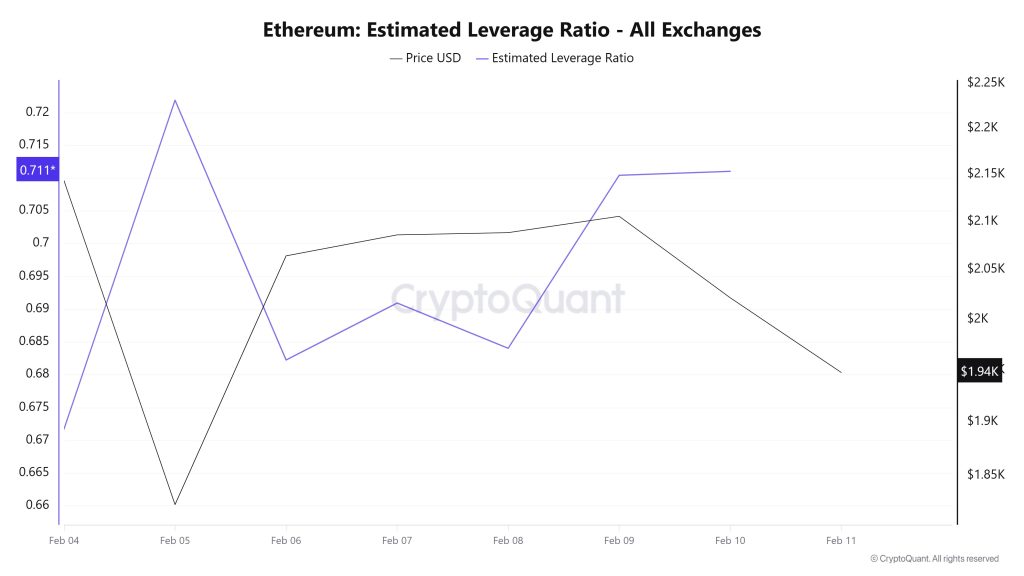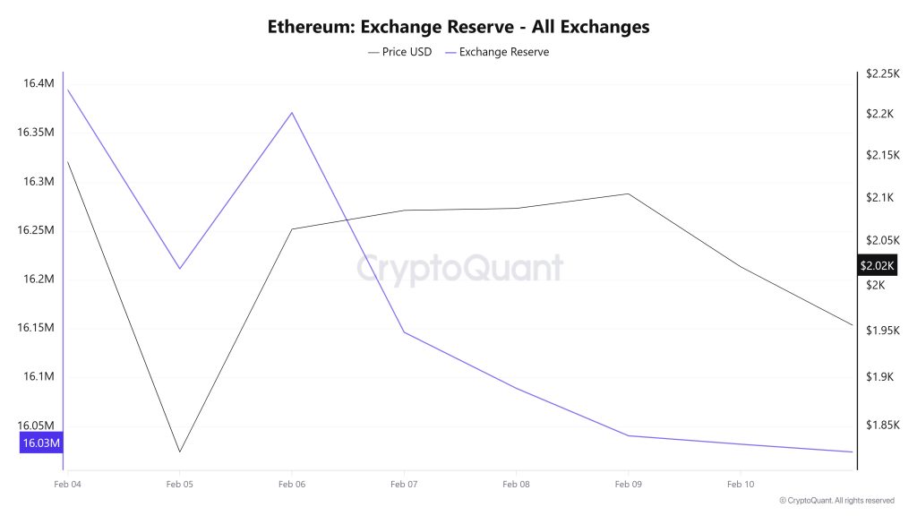 The metric followed a horizontal trend throughout the 7-day period. On February 4, the first day of the period, the metric stood at 0.671. It rose from this level, reaching its peak on February 5 at 0.721. The metric has remained flat for the remainder of the process and currently stands at 0.711. A higher ELR indicates that participants are more willing to take on risk and generally signals bullish conditions or expectations. Uptrends can also be driven by a decrease in reserves. Looking at Ethereum reserves, there were 16.39 million reserves at the beginning of the process, but this figure declined during the rest of the process and has now fallen to 16.01 million. At the same time, Ethereum’s Open Interest was seen at $26.30 billion at the beginning of the process. As of now, volume has declined during the process, and open interest has fallen to $24.11 billion. With all this data, the ELR metric has remained flat for most of the process. The asset’s price has fluctuated between $2,200 and $1,750 with all this data. Ultimately, the decline in open interest volume and reserves throughout the process explains the flat trend in the ELR metric. This indicates that investor risk appetite has increased slightly but has not fully recovered from the decision-making phase.