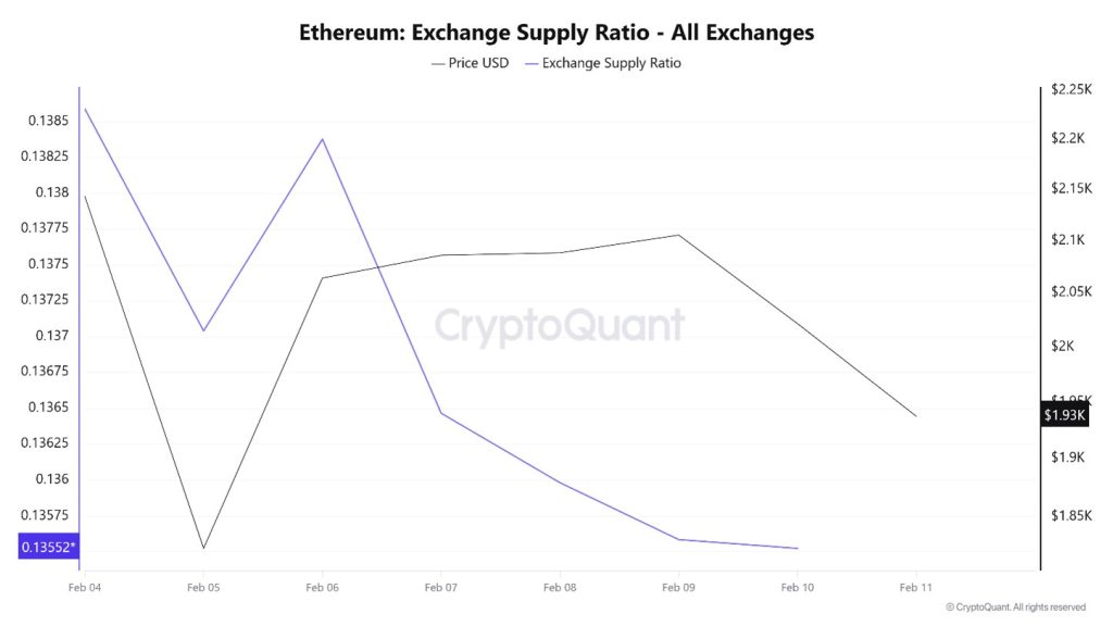 According to Ethereum Exchange Supply Ratio data, a significant decline in the supply ratio of Ethereum held on exchanges was observed during the period under review. This week, there is a positive correlation between the Ethereum price and the supply ratio on exchanges. The decline in the Exchange Supply Ratio indicates that Ethereum is being withdrawn from exchanges and held in cold wallets, suggesting that there is no intense selling pressure in the short term. Between February 4 and February 11, the Ethereum Exchange Supply Ratio declined from 0.13859082 to 0.13558601. During the same period, the Ethereum price retreated from $2.143 to the $2.105 range.