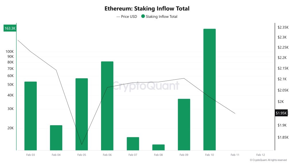 On February 4, when the ETH price was trading at $2,143, Staking Inflow was at 21,434. As of February 10, while the ETH price fell to $2,021, Staking Inflow rose to 163,310, recording a strong increase of 661.97%. The sharp rise in Staking Inflow indicates that new inflows into staking have accelerated significantly this week and that marginal staking demand has regained strength. However, the price remaining weak during the same period suggests that the recovery in staking inflows has produced a balancing factor that absorbs more supply in the short term, but may not be sufficient to be the sole determinant on the price side as long as risk appetite remains impaired.