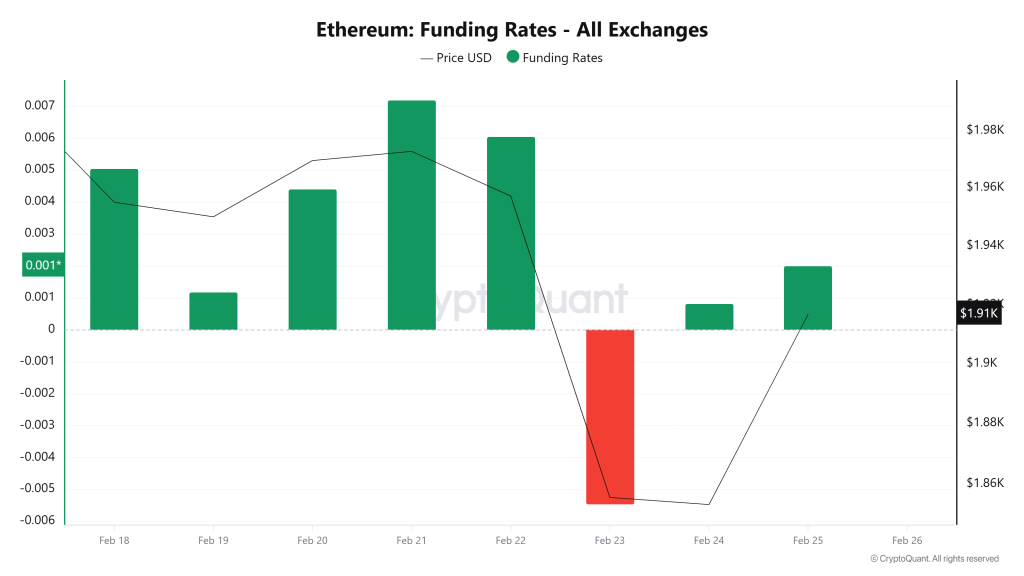 The ETH funding rate has generally been positive, meaning that the long side has remained dominant in the market. The sharp shift to negative on February 23 indicates a short-term long squeeze and panic closing. Its subsequent return to positive shows that long appetite has returned but is still fragile.