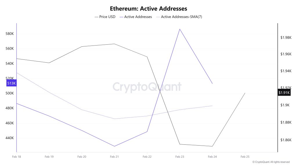 Between February 18 and February 24, there were a total of 3,385,819 active address entries on the Ethereum network. During this period, the Ethereum price fell from $2,000 to $1,800. A significant drop in the price curve was observed on February 23, when the number of active addresses peaked. When examining the 7-day simple moving average (SMA), it can be seen that the Ethereum price has been steadily declining.