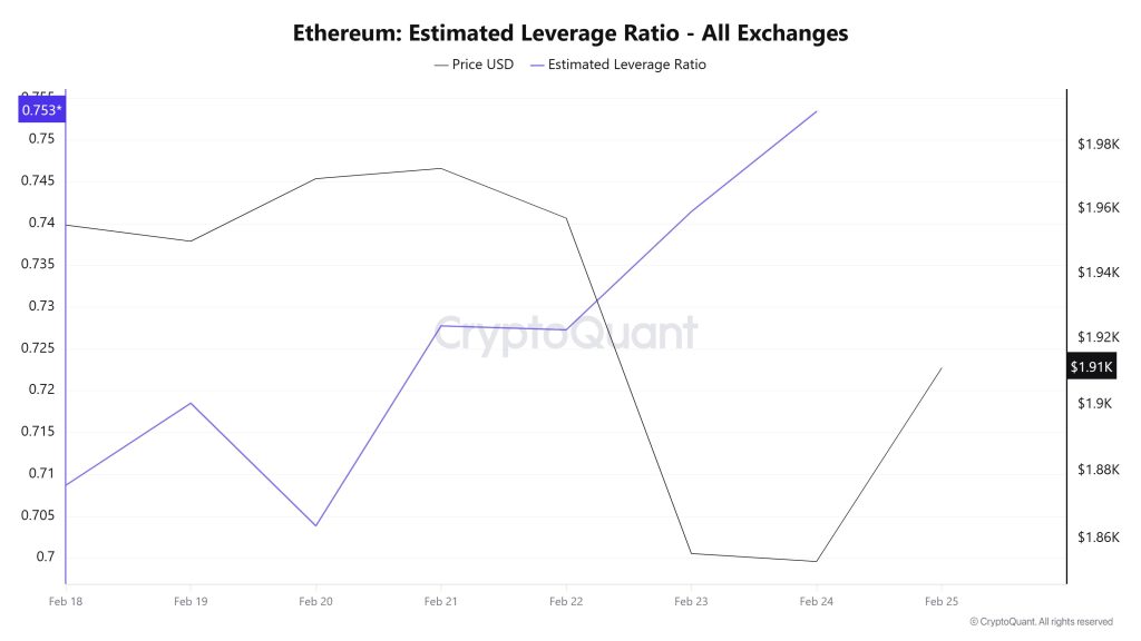 The metric experienced an increase over the 7-day period. Starting at 0.708 on February 18, the first day of the period, the metric rose steadily from that level. Currently at 0.753, the metric is at its highest point. A higher ELR indicates that participants are willing to take on more risk and generally signals bullish conditions or expectations. Uptrends can also be driven by a decrease in reserves. Looking at Ethereum reserves, there were 16.12 million reserves at the start of the process, but this figure remained within a narrow band for the remainder of the process and has now fallen to 16.09 million. At the same time, Ethereum’s open interest was seen at $23.57 billion at the beginning of the process. Currently, the volume has remained flat within a narrow band during the process, and open interest has declined to $23.48 billion. With all this data, the ELR metric experienced an uptrend for most of the process. The asset’s price fluctuated between $1,800 and $2,000 alongside all this data. Ultimately, the horizontal trend in open interest volume and reserves throughout the process indicates that the slight rise in the ELR metric was a bubble. This shows that investors’ risk aversion persists.