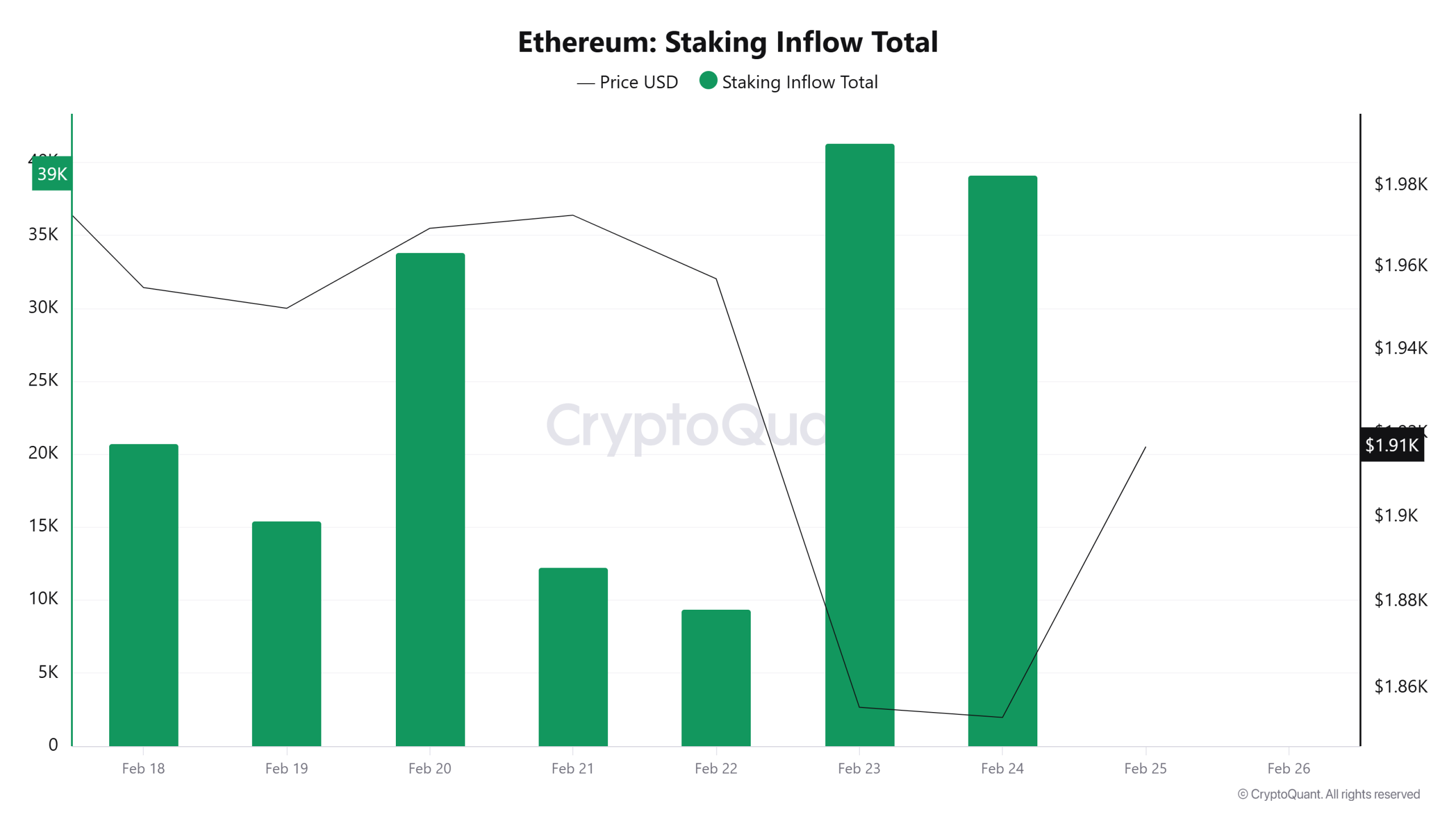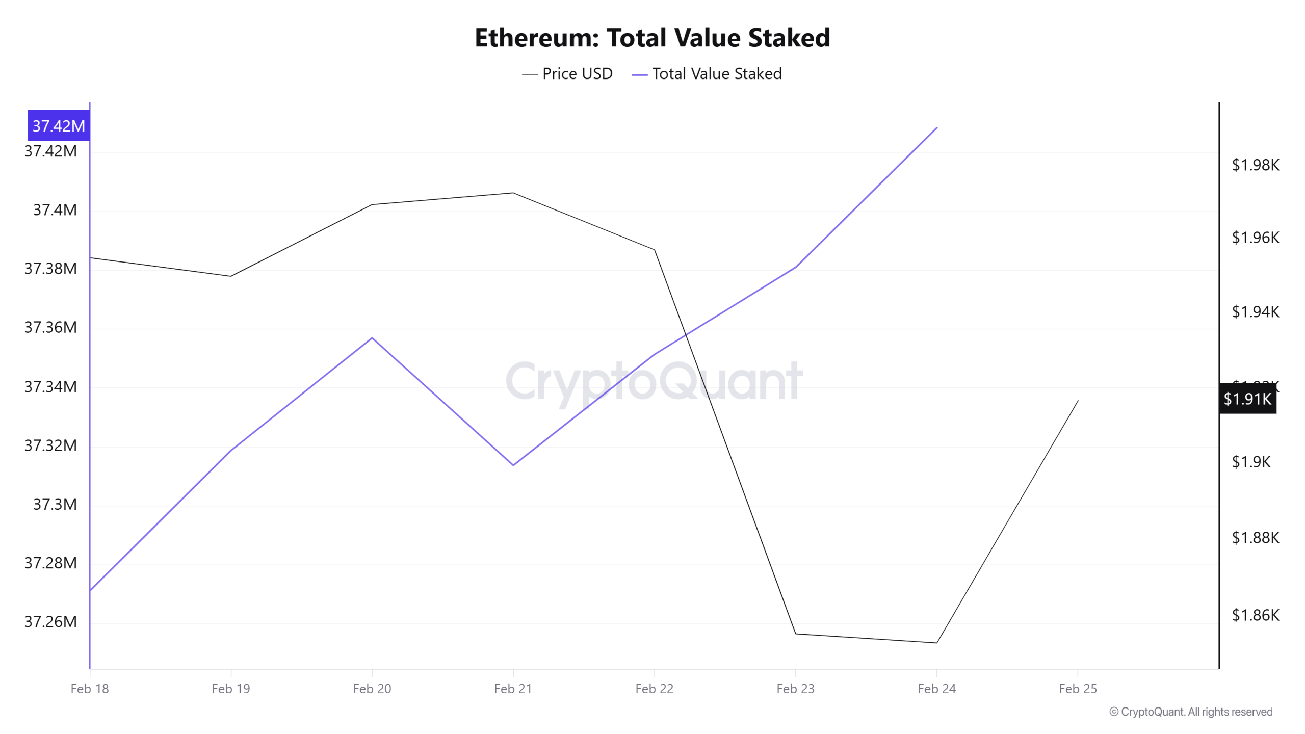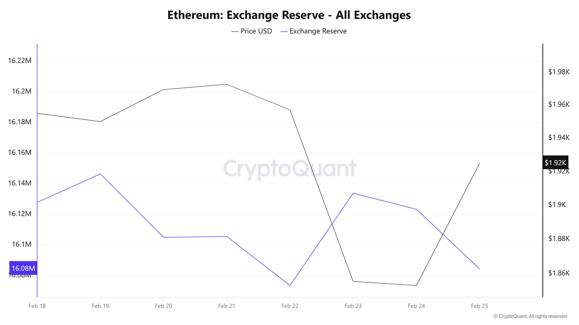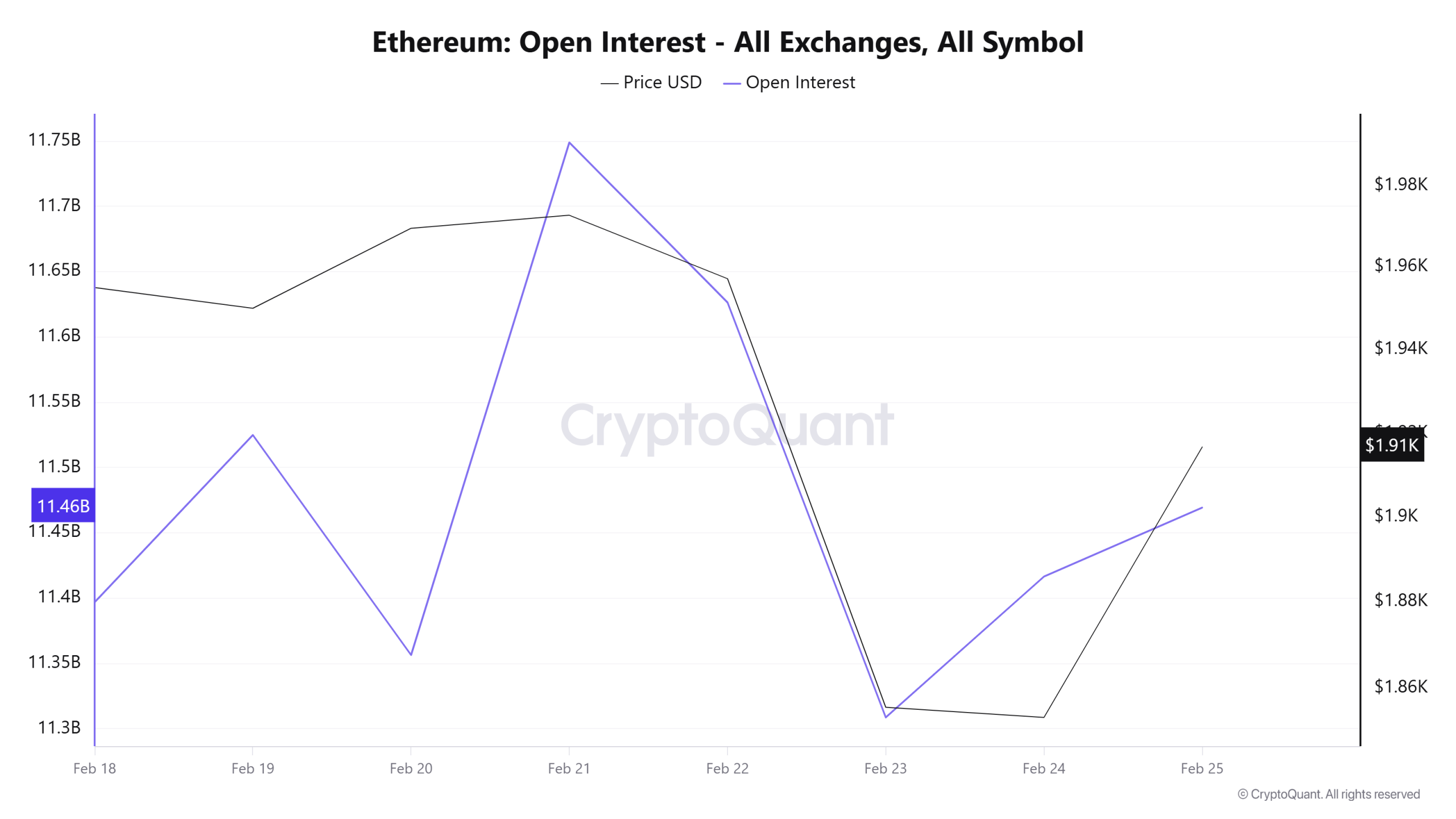 The metric experienced an increase over the 7-day period. Starting at 0.708 on February 18, the first day of the period, the metric rose steadily from that level. Currently at 0.753, the metric is at its highest point. A higher ELR indicates that participants are willing to take on more risk and generally signals bullish conditions or expectations. Uptrends can also be driven by a decrease in reserves. Looking at Ethereum reserves, there were 16.12 million reserves at the start of the process, but this figure remained within a narrow band for the remainder of the process and has now fallen to 16.09 million. At the same time, Ethereum’s open interest was seen at $23.57 billion at the beginning of the process. Currently, the volume has remained flat within a narrow band during the process, and open interest has declined to $23.48 billion. With all this data, the ELR metric experienced an uptrend for most of the process. The asset’s price fluctuated between $1,800 and $2,000 alongside all this data. Ultimately, the horizontal trend in open interest volume and reserves throughout the process indicates that the slight rise in the ELR metric was a bubble. This shows that investors’ risk aversion persists.