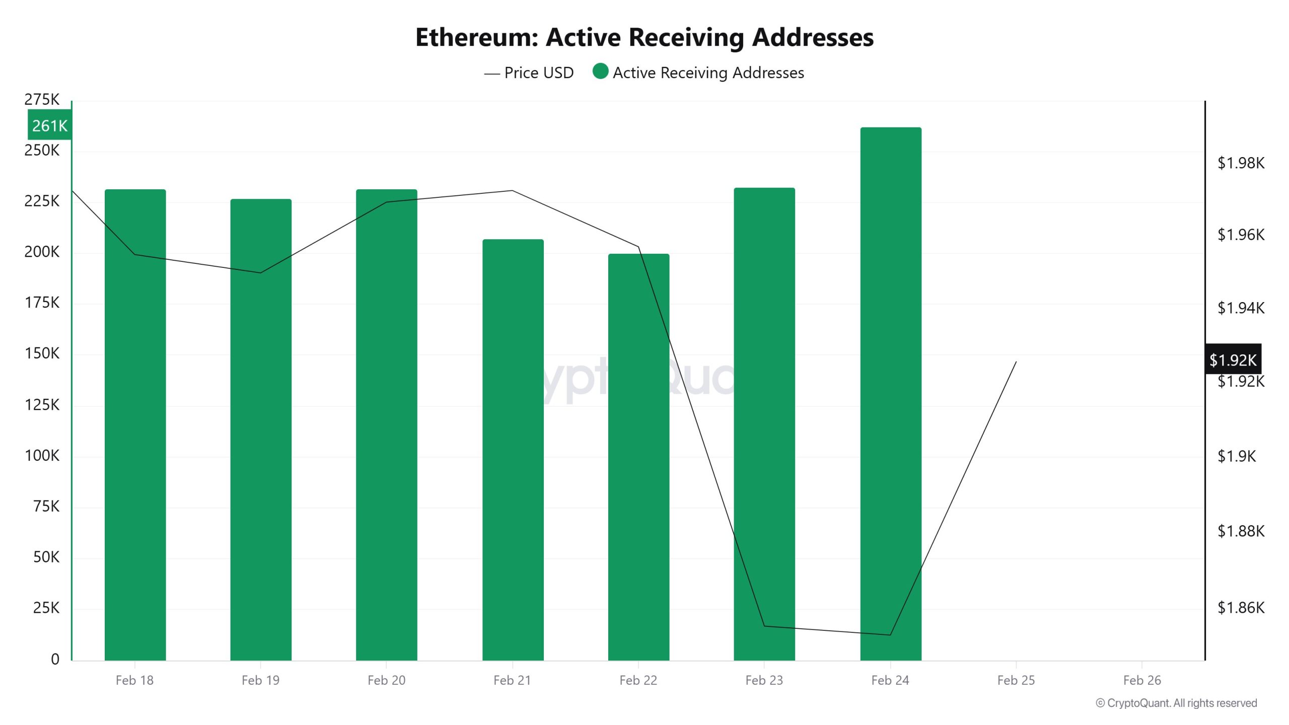Between February 18 and February 25, there was no significant increase in active receiving addresses, except on the last day, while the price also moved downward, except on the last day. On the day the price reached its lowest level, active receiving addresses reached 261,947, indicating an increase in sales.