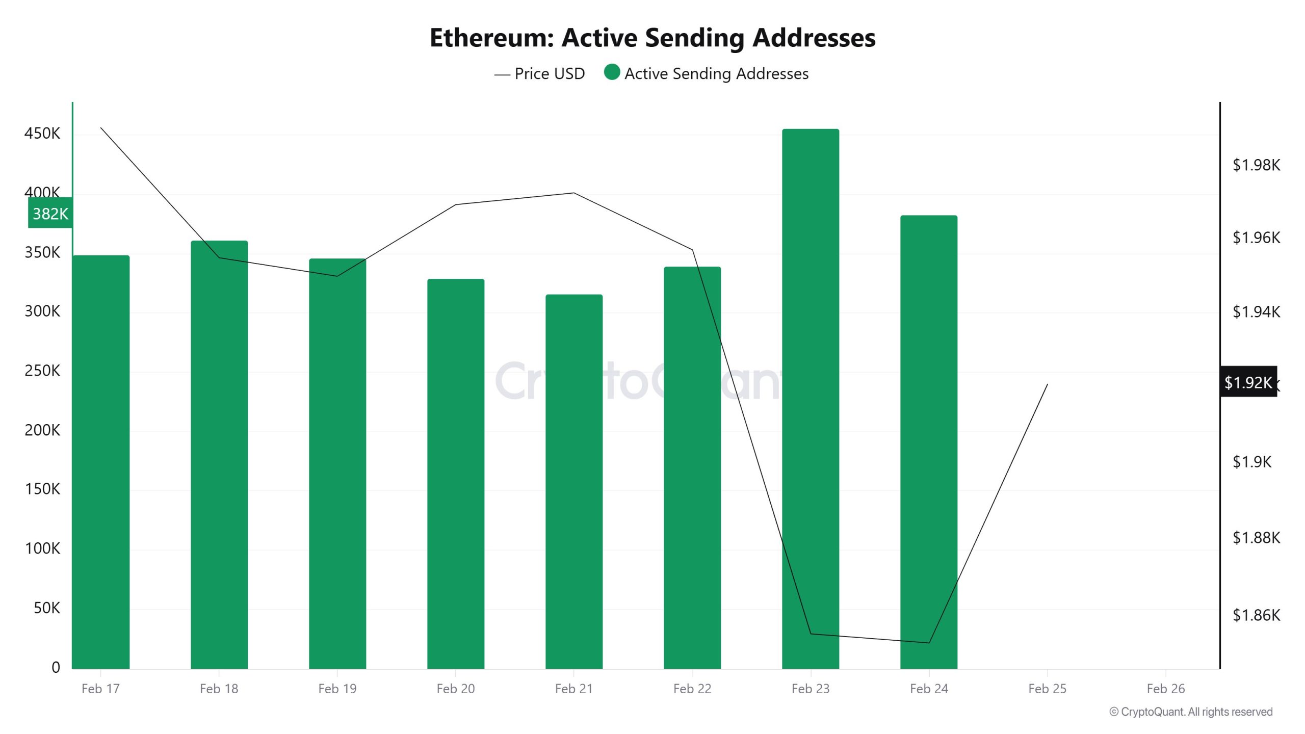 Between February 18 and February 25, high levels of active sending activity were observed in active sending addresses, as indicated by the Black Line (price line). On the day the price approached its lowest level on a weekly basis, active sending addresses reached 455,268.