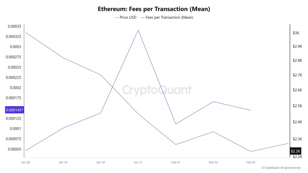 When examining the Ethereum Fees per Transaction (Mean) data between January 28 and February 3, it is observed that on January 28, the first day of the week, the indicator reached 0.000047280799923441.