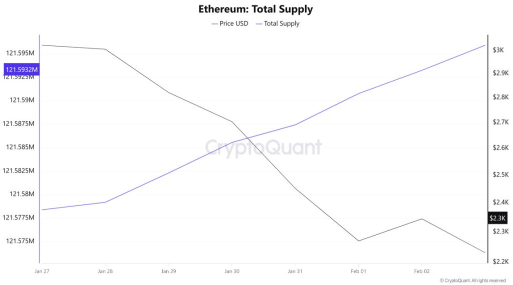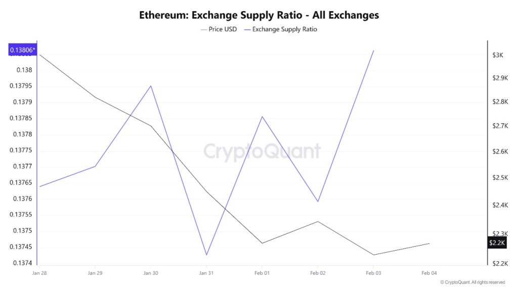 According to Ethereum Exchange Supply Ratio data, a significant decline in the ratio of Ethereum held on exchanges was observed during the period under review. This week, there is a positive correlation between the Ethereum price and the supply ratio on exchanges. The decline in the Exchange Supply Ratio indicates that Ethereum is being withdrawn from exchanges and held in cold wallets, suggesting that there is no intense selling pressure in the short term. Between January 28 and February 4, the Ethereum Exchange Supply Ratio declined from 0.1376390 to 0.1375296. During the same period, the Ethereum price retreated from $3.005 to the $2.344 range.