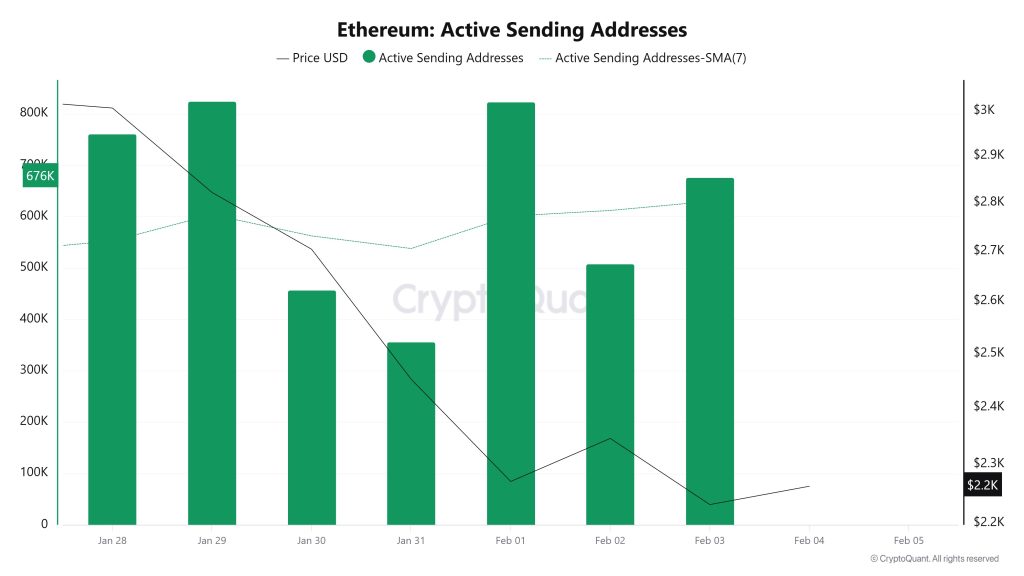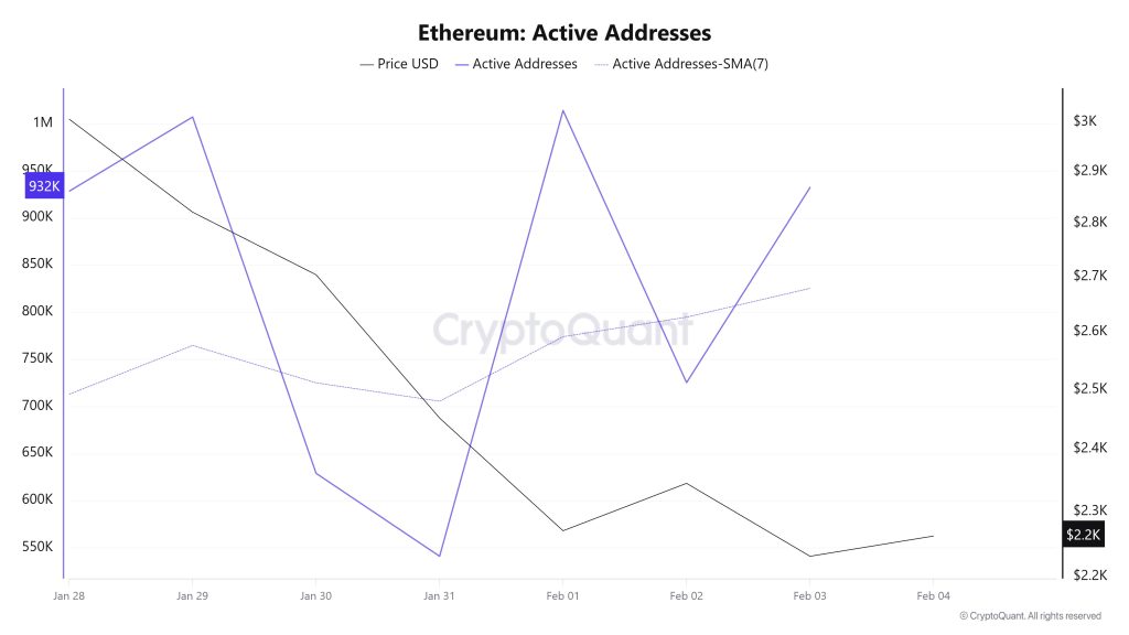 Between January 28 and February 4, a total of 1,813,804 active addresses were added to the Ethereum network. During this period, the Ethereum price retreated from $3,002 to $2,226. Particularly on January 31, when the price hit the active address point, the number of active addresses increased while a significant decline was observed in the price point. When examining the 7-day simple moving average (SMA), it is seen that the Ethereum price is generally trending downward.