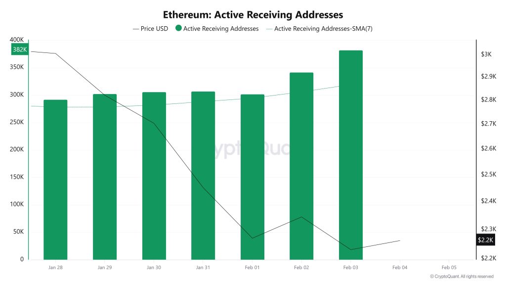 Between January 28 and February 4, while there was no significant increase in active receiving addresses, the price was seen to move upward. On the day the price reached its highest level, active receiving addresses reached 382,175, indicating an increase in sales.