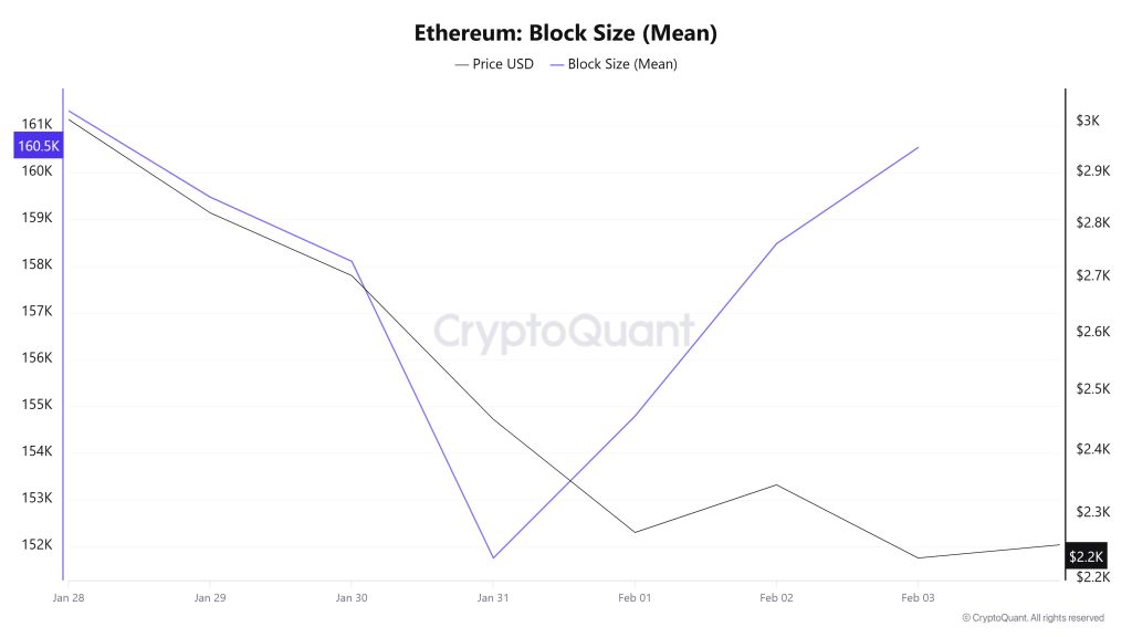 When examining the Ethereum block size data between January 28 and February 3, a slight decrease was observed throughout the week. While the average block size was measured at 161,322 bytes on January 28, this value decreased to 160,538 bytes as of February 3.