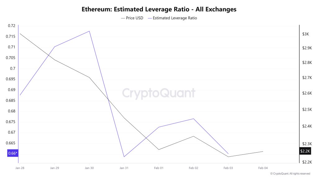 Over the 7-day period, the metric followed a downward trend overall. Starting at 0.687 on January 28, the first day of the period, the metric rose from this level, reaching its peak on January 30 at 0.717. The metric then began to decline during the remainder of the process and is currently at its lowest point, reaching a value of 0.660. A higher ELR indicates that participants are willing to take on more risk and generally indicates bullish conditions or expectations. Uptrends can also be caused by a decrease in reserves. Looking at Ethereum reserves, there were 16.26 million reserves at the beginning of the process, and this figure increased during the rest of the process, rising to 16.35 million at the moment. At the same time, Ethereum’s Open Interest was seen at $39.80 billion at the beginning of the process. As of now, volume has shown a sharp decline during the process, and open interest has fallen to $26.30 billion. With all this data, the ELR metric followed a downward trend for most of the process. The asset’s price fluctuated between $3,050 and $2,200 with all this data. Ultimately, the sharp decline in open interest volume and the rise in reserves throughout the process explain the decline in the ELR metric. This indicates that investors have no appetite for risk and that pessimism is high.