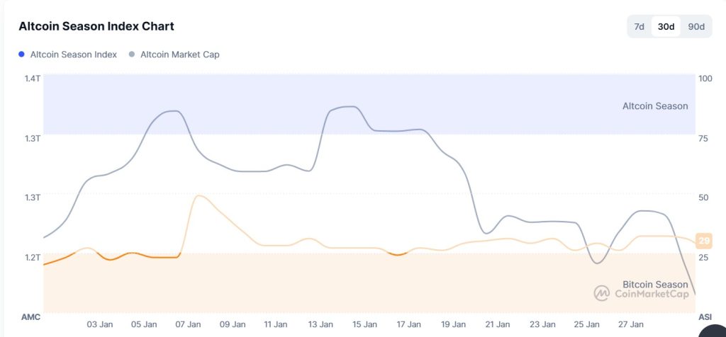 Between January 24 and January 29, 2026, a decline was observed in the correlation between altcoin market dominance (Altcoin Market Cap) and the Altcoin Season Index. The graph shows that Altcoin Market Cap reached its highest point this week on January 28 at 1.24T. As the week came to a close, selling pressure increased, leading to a decline in market dominance. The top 5 coins leading the index’s rise this week were RIVER, MYX, CHZ, AXS, and PAXUSDT. US President Trump’s statements this week regarding the Fed Chair and the FOMC meeting agenda caused a decline in the Altcoin Season Index, showing that the total market value of altcoins experienced a relative decline compared to Bitcoin.