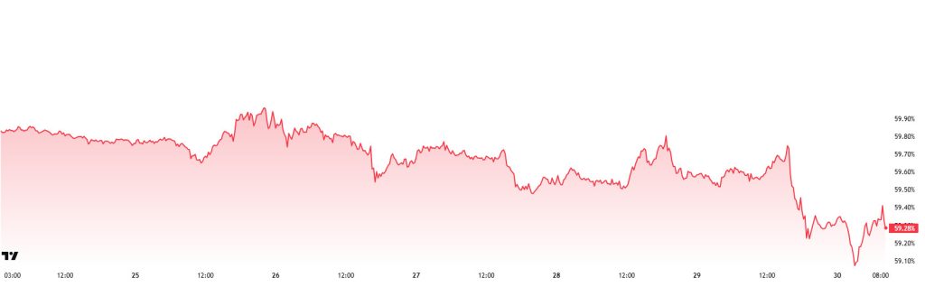 Bitcoin dominance started the week at 59.85%, fell back to 59.14% during the week, but then rose slightly and is currently at 59.28%.