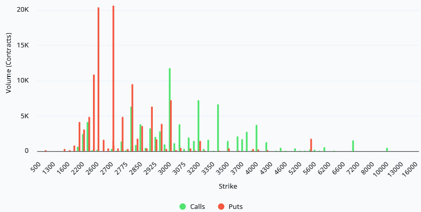 Laevitas Data: Looking at the data in the chart, we see that put options are concentrated in a fairly wide band, particularly between the $2,700 and $3,000 price levels. The highest put volume is at the $2,700 level, with approximately 21K contracts. On the other hand, call options show a notable concentration between the $3,000 and $3,200 levels. The highest call volume appears to be approximately 12K at the $3,000 level.