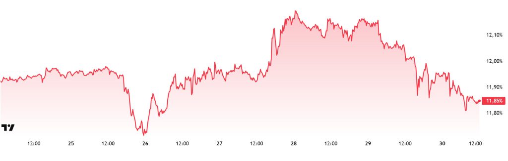 In this context, Ethereum dominance ended last week at 12.62% and is currently trading at around 11.85%. During the same period, Bitcoin dominance followed a similar negative trend to Ethereum dominance.