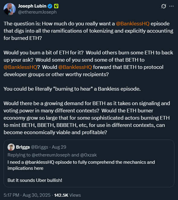 The launch of BETH has resurfaced deep debates about Ethereum’s monetary policy. Zak Cole, founder of the Ethereum Team Smart Contracts community, stated that BETH should not be treated as an appreciating asset; it should be viewed purely as proof of burn, not as a new asset. According to him, BETH serves as a receipt that defines “representative rights” to the burned ETH and cannot be directly converted back into ETH.