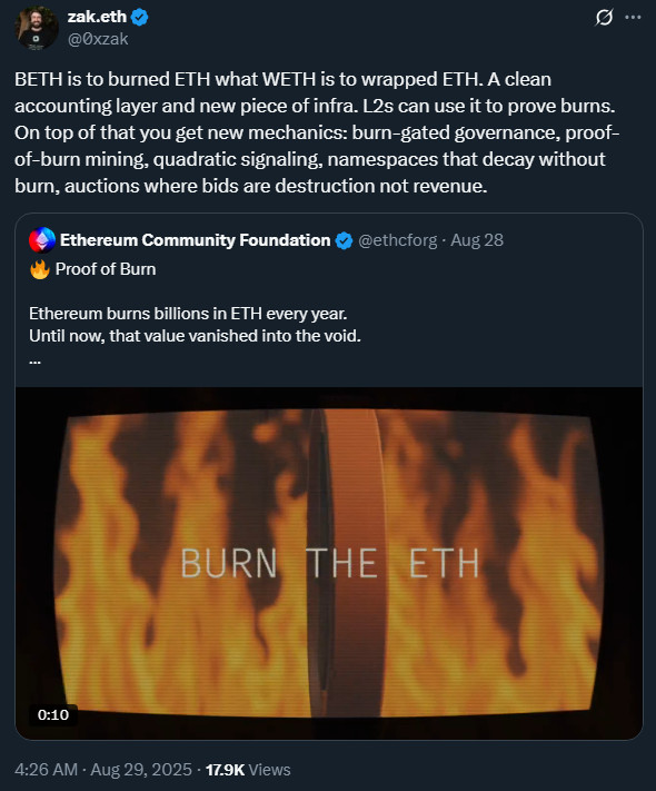 In the Ethereum community, BETH’s design has sometimes been compared to WETH (Wrapped ETH). Zak Cole, founder of ECF and Ethereum developer, has said that BETH is “WETH for burned ETH” and emphasized that BETH provides a clean layer for tracking burns, just as WETH moves ETH to a standard interface in smart contracts. Thanks to this architecture, the BETH contract records mint and burn transactions in a clear and provable way; all transactions are archived on the Ethereum blockchain. Thus, it is publicly verifiable which burn transaction each BETH token is associated with.