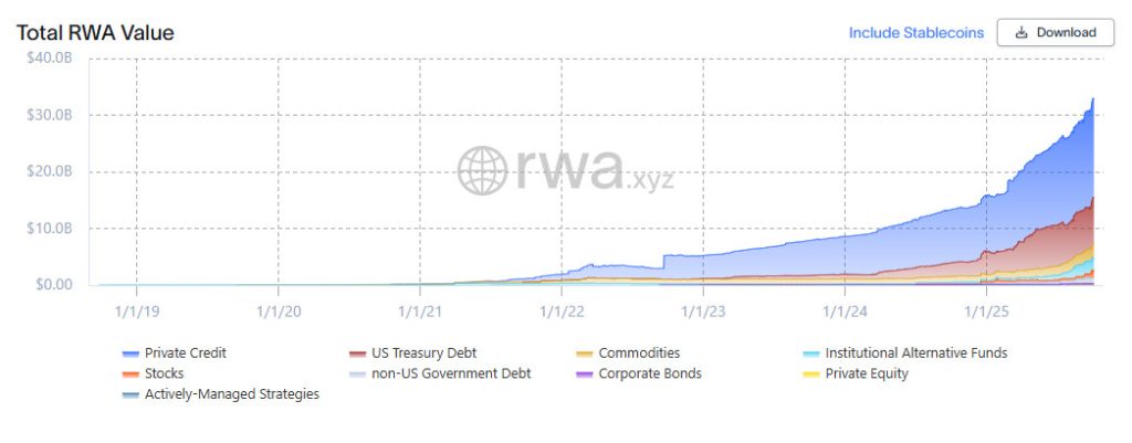 The tokenization of real-world assets (RWA) is experiencing rapid growth. According to RWA.xyz, the total value of on-chain tokenized assets exceeded $30 billion by September 2025. This shows that the on-chain RWA market has grown exponentially in recent years, driven by institutional interest.