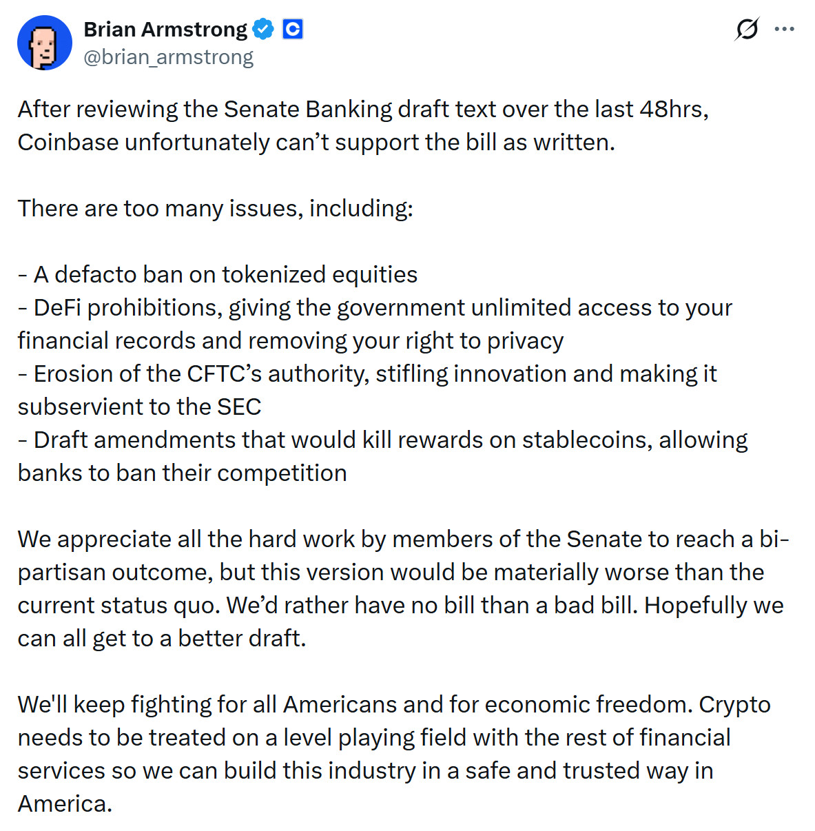 In addition to Galaxy Digital’s criticism at the corporate level, Coinbase’s top management also expressed their opposition. Coinbase CEO Brian Armstrong stated on his official X account that the latest draft prepared by the Senate Banking Committee could not be supported in its current form.
