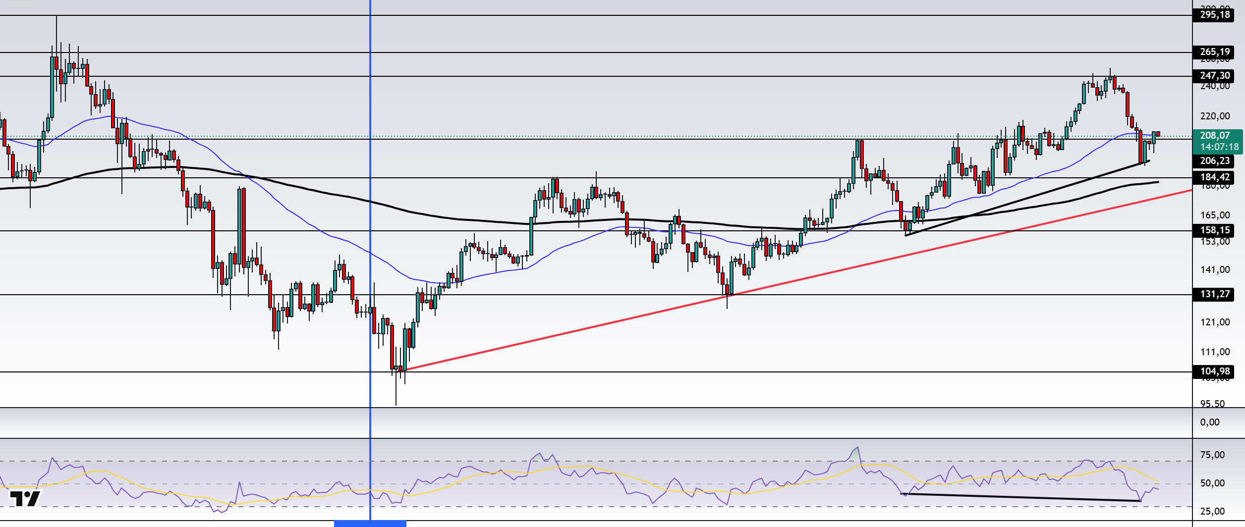 The asset is trading between the 50 EMA (Exponential Moving Average – Blue Line) and 200 EMA (Black Line) moving averages, indicating that the asset is in the decision phase. Moreover, the fact that the 50 EMA continues to be above the 200 EMA indicates that a “golden cross” formation is in progress from a technical perspective. This shows that the upside potential continues in the medium term. On the other hand, the large gap between the two moving averages increases the likelihood of a sideways move or a decline. RSI (14) is at a negative level. At the same time; there is a positive divergence. This may create buying pressure. If macroeconomic data remains positive and ecosystem developments remain positive, the first major resistance point of $247.30 could be retested. Conversely, in case of possible negative news flow or deterioration in macro data, the $184.42 level can be monitored as a potential buying opportunity.