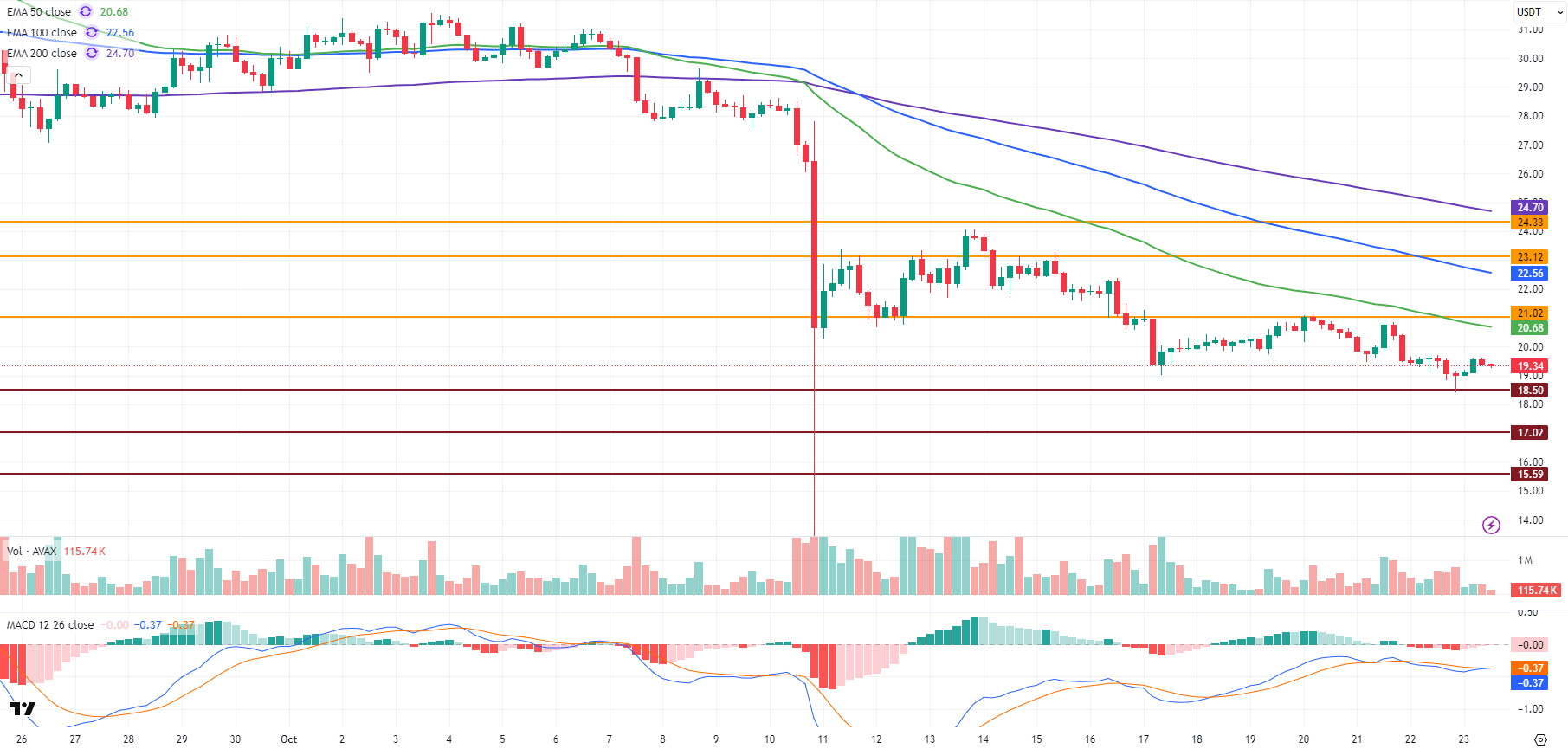 From a technical perspective, the $21.02 level remains important for AVAX on the upside. If this level is exceeded, the $23.12 and $24.33 levels could come into play. Conversely, in a downward movement, the $18.50 level could be retested. If the price closes below this level, selling pressure could increase, and a pullback to the $17.02 and $15.59 levels could come into play. In the overall picture, a weak recovery signal is observed on the MACD side, while the negative trend structure is maintained on the EMA side. For momentum to strengthen, a significant increase in trading volume is required. Otherwise, AVAX may continue its sideways movement in the $18.50-$19.75 range in the short term.
