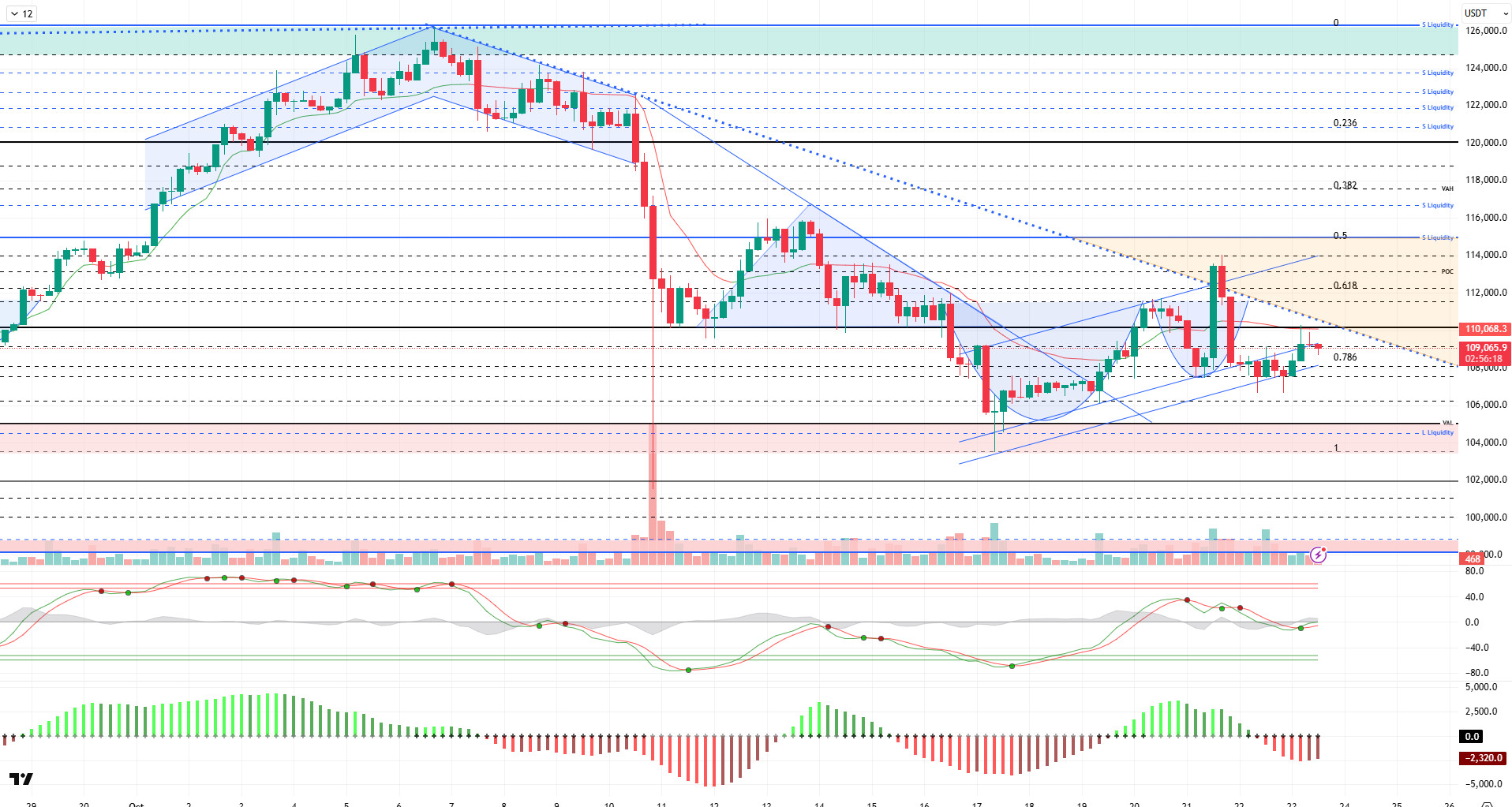 In summary, on the fundamental side, setbacks in the reconciliation process between the US and China are causing continued strong selling pressure in the market. Statements from the Trump camp continue to be decisive for the direction of the markets during this period. The lack of concrete developments regarding the reopening of the US government is another factor that investors are watching closely. On the other hand, the search for a solution on the Russia-Ukraine front, carried out with the support of the EU, stands out as an optimistic development for the markets. Technically, BTC continues to test the 110,000 reference level, while liquidity data shows a decrease in the selling level. In the coming period, the price holding within the minor rising channel stands out as a critical threshold, while closes above the 110,000 level could make the 115,000 level a target. In the event of potential selling pressure, 107,400 has become an important support area.