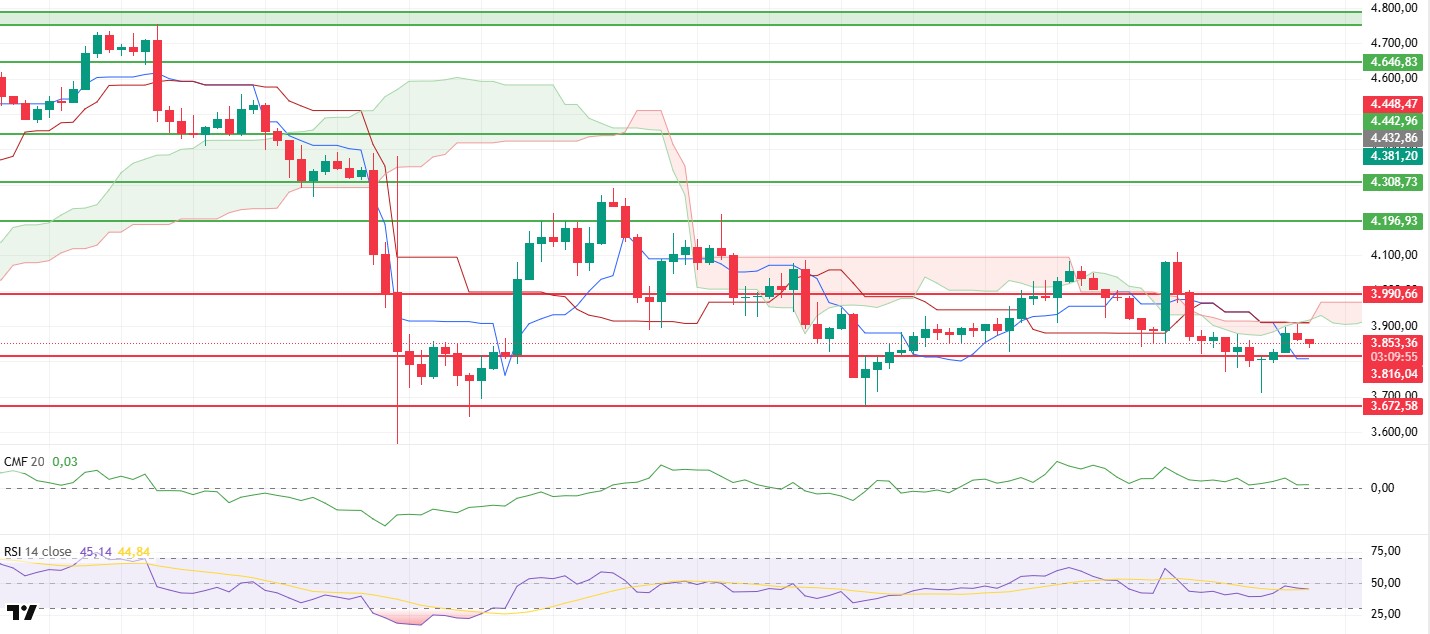 The ETH price encountered resistance during the day at the lower band of the cloud at $3,905 and the intersection of the Kijun line. Selling pressure from this area pushed the price down, causing it to retreat to the $3,840 level. The price holding at this level indicates that buyers are still active in the short term, but selling pressure is regaining strength.